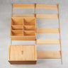 Modular shelving system in oak comprising two cabinets and seven shelves. One cabinet features four compartments, the other includes two shelves with sliding tambour doors. Comes with three wood-veneered metal support rails and a total of 12 components. One shelf retains the original manufacturer's label.