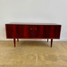 Vintage cabinet by Brouer, crafted in richly grained rosewood, Denmark, circa 1960s–1970s. Features two doors with sculpted handles, opening to reveal adjustable shelving for versatile storage. Elevated on tapered legs, highlighting its classic mid-century profile. In good vintage condition with minor wear consistent with age and use.