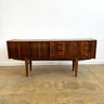 Elegant Danish modern low sideboard in richly grained rosewood, composed of two connected modules: one with four drawers and the other with sliding doors revealing adjustable shelving. Raised on tapered legs with clean joinery throughout. A functional and stylish storage piece with strong lines and beautiful natural figuring.