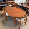 Round expandable teak dining table by Harry Østergaard. A beautifully crafted piece that features two extension leaves, allowing the table to transform from a compact round form to a spacious oval. The teak wood shows rich grain and warm tone throughout, with tapered legs and classic Danish lines. In good vintage condition with light signs of use. A timeless and functional piece ideal for both everyday use and entertaining.