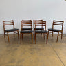 A well-crafted set of six dining chairs by Skovby, designed and produced in Denmark during the 1960s. The solid teak frames feature a sculpted ladder-back design, offering both elegance and comfort. Seats are upholstered in black vinyl, providing a sleek contrast to the warm wood grain and ensuring easy maintenance.