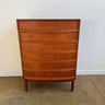Stunning Danish teak tallboy with elegant bow-front drawers. This beautifully crafted piece is in fantastic restored condition, showcasing exquisite handle details and expert dovetail joinery throughout. A true standout example of Danish design! In good vintage condition.