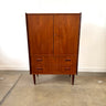 Beautifully crafted Mid-Century Danish teak armoire featuring clean lines, sculpted drawer pulls, and a warm teak grain. The upper cabinet opens to reveal generous adjustable shelving space, while the lower section offers two spacious drawers for additional storage. Ideal for use as a compact wardrobe, entry cabinet, or media storage.