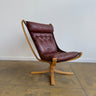 A classic Scandinavian lounge design, the Falcon chair was created by Norwegian designer Sigurd Resell for Vatne Møbler. This high-back version features a distinctive bent oakwood frame with cross base construction, supporting a suspended sling seat with original tufted leather cushions in deep burgundy. The chair combines lightness and strength with timeless comfort, making it one of the most recognizable icons of Norwegian modern design.