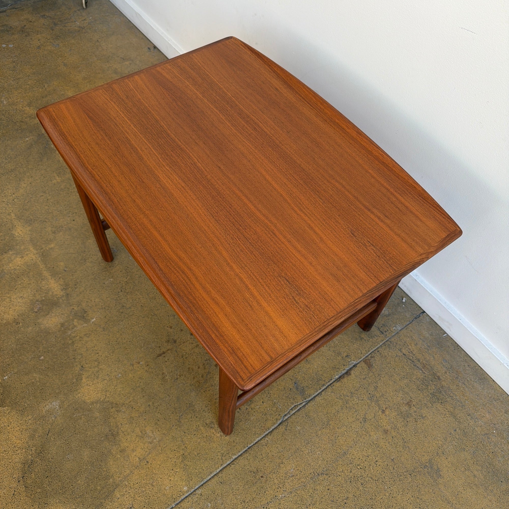 Beautiful teak side table designed by Folke Ohlsson for DUX. Features a gently curved top, refined edges, and tapered legs that give it a light, sculptural presence. Classic Scandinavian proportions with warm teak grain throughout.