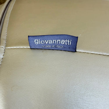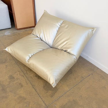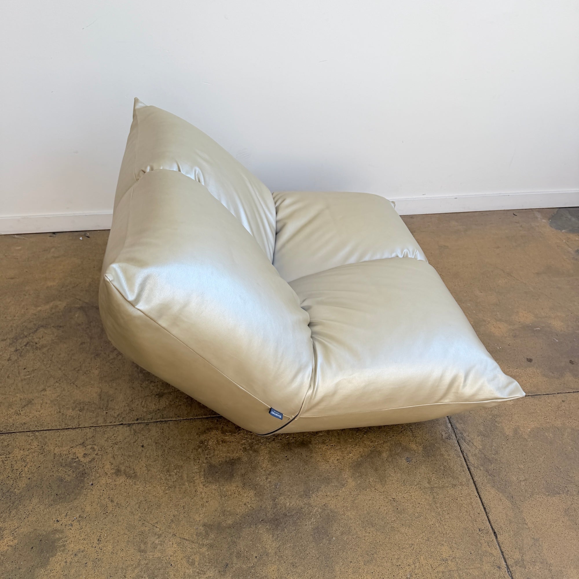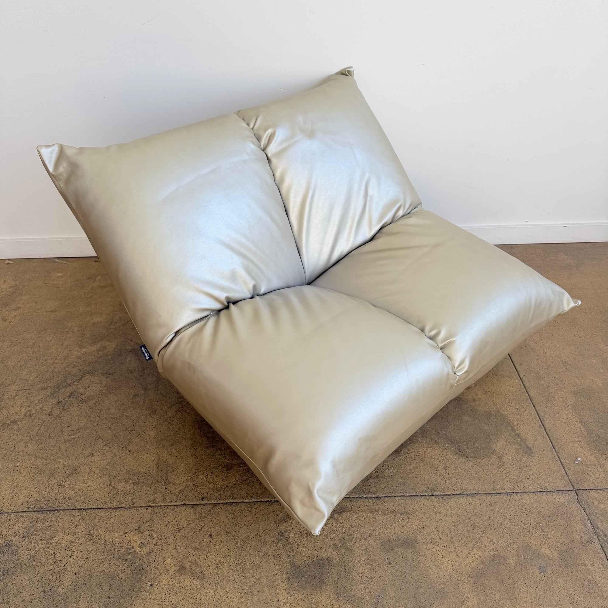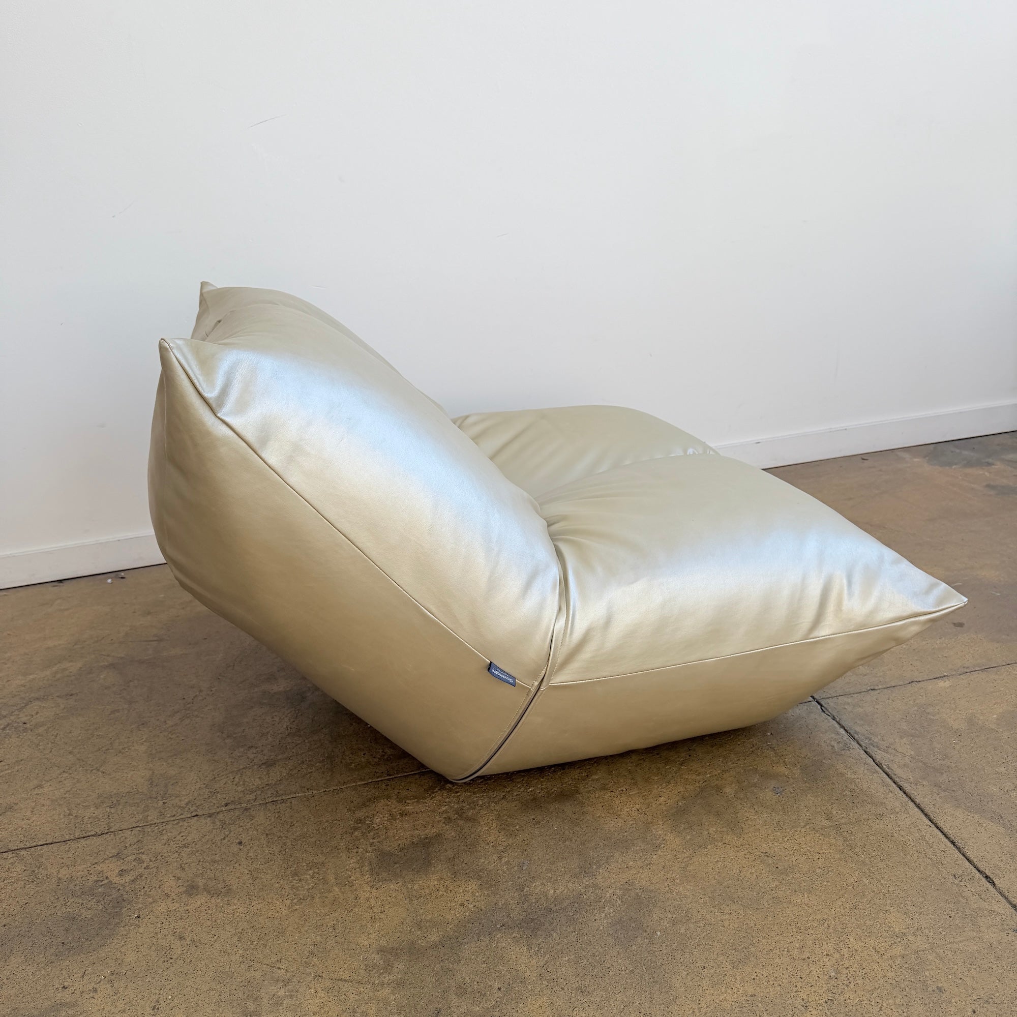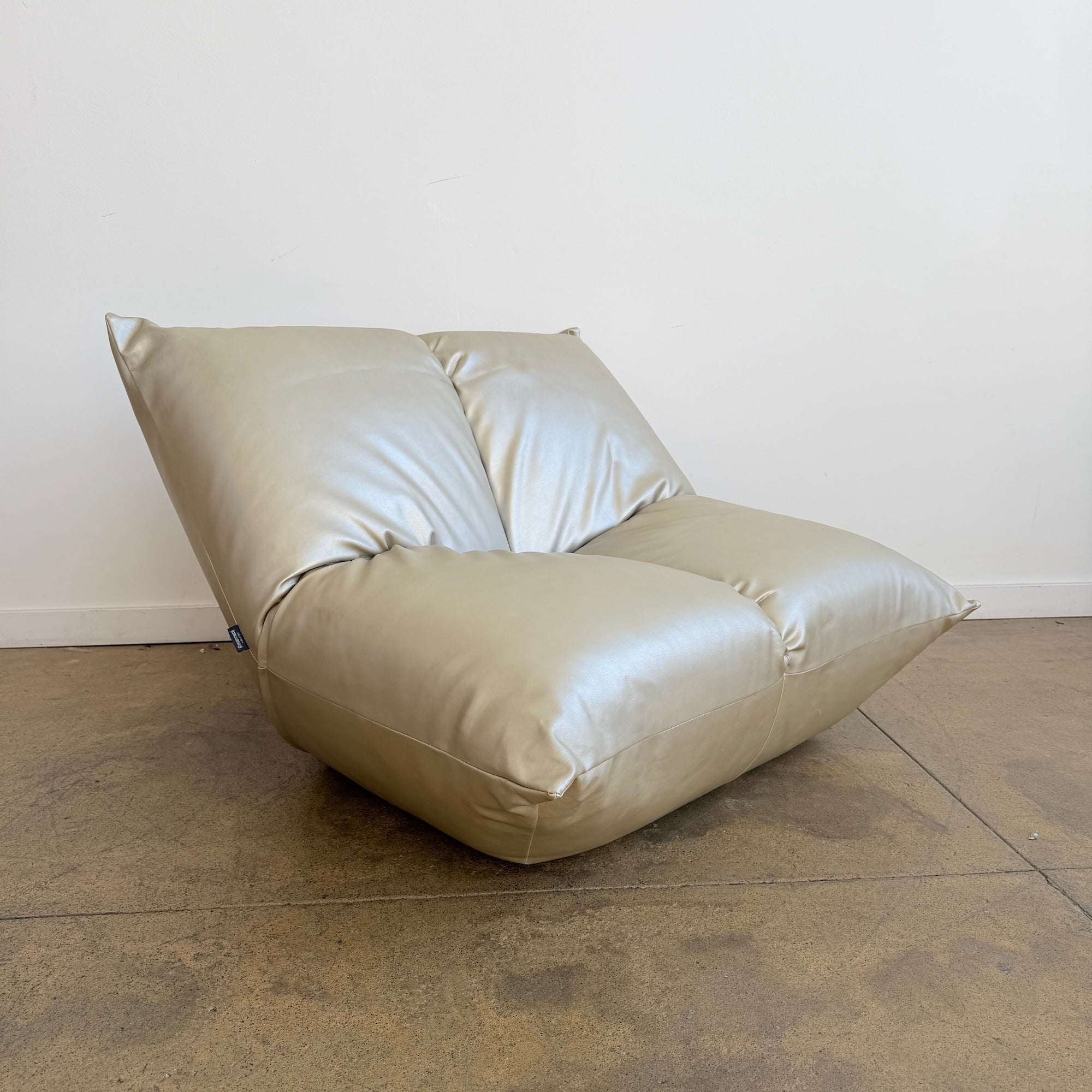 Upholstered in a metallic champagne leatherette, the chair reflects the bold material experimentation of the 1970s while remaining surprisingly versatile in contemporary interiors. The upholstery is in very good condition with no notable damage, and the structure remains comfortable and supportive. Rare to find in this fabric and overall condition.