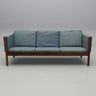 The sofa is built on a solid rosewood frame with firm upholstery, balanced by loose seat and back cushions that introduce softness to the clean-lined form. Wegner’s innovation of down-wrapped foam cushions added a new level of comfort while retaining structural precision.