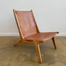 Designed by Swedish duo Uno & Östen Kristiansson in the 1950s for Luxus, this Model 204 Hunting Chair exemplifies Scandinavian modernism. Crafted with a minimalist oak frame and a suspended saddle leather seat and backrest, it offers both comfort and visual lightness. The chair is in good vintage condition with minor wear consistent with age. It is sold as-is.