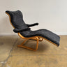 A unique Scandinavian lounger featuring bent plywood and soft charcoal sheepskin for added comfort. Its stylish cantilever design and reclining feature make it perfect for relaxation, while the armrests provide extra support. Ideal for those moments of daydreaming.