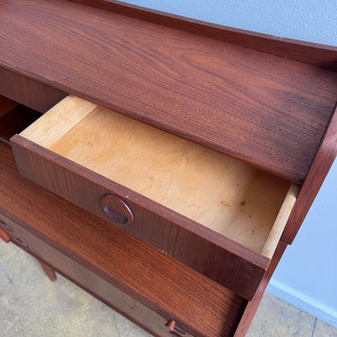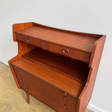 A beautifully crafted Danish secretary desk in teak, featuring a compact yet highly functional design. The upper section includes two small drawers with sculpted circular pulls, an open display shelf, and a drop-front writing surface. Below, three deep drawers provide ample storage, also detailed with inset circular handles. The angled sides and tapered legs give the piece its distinctive mid-century profile.
