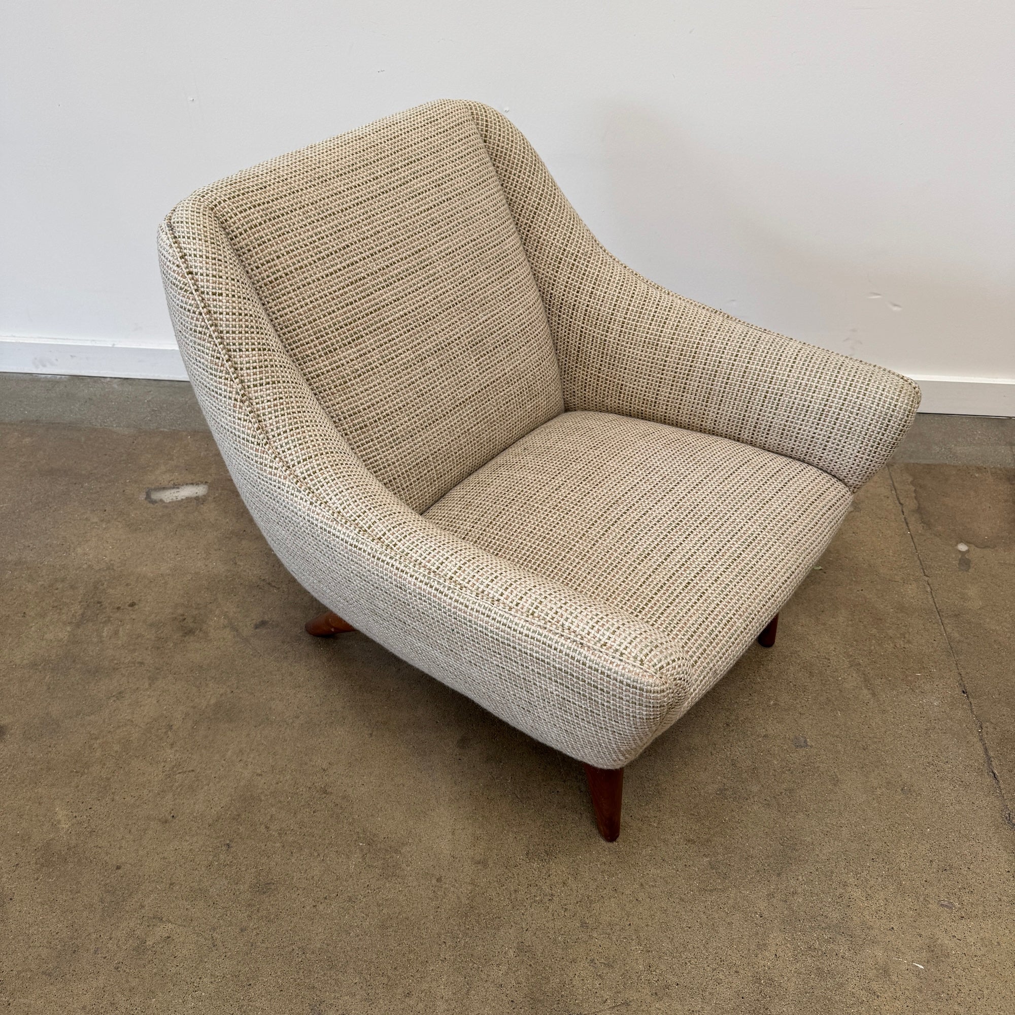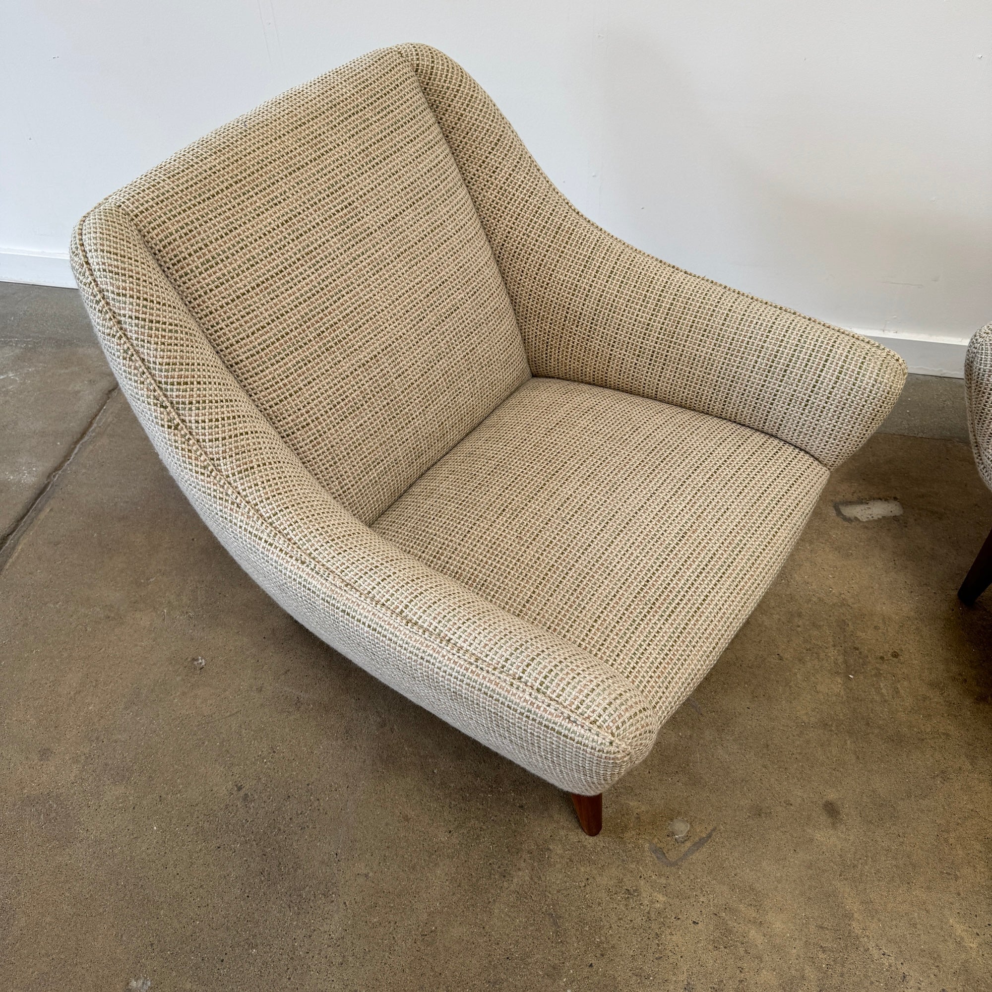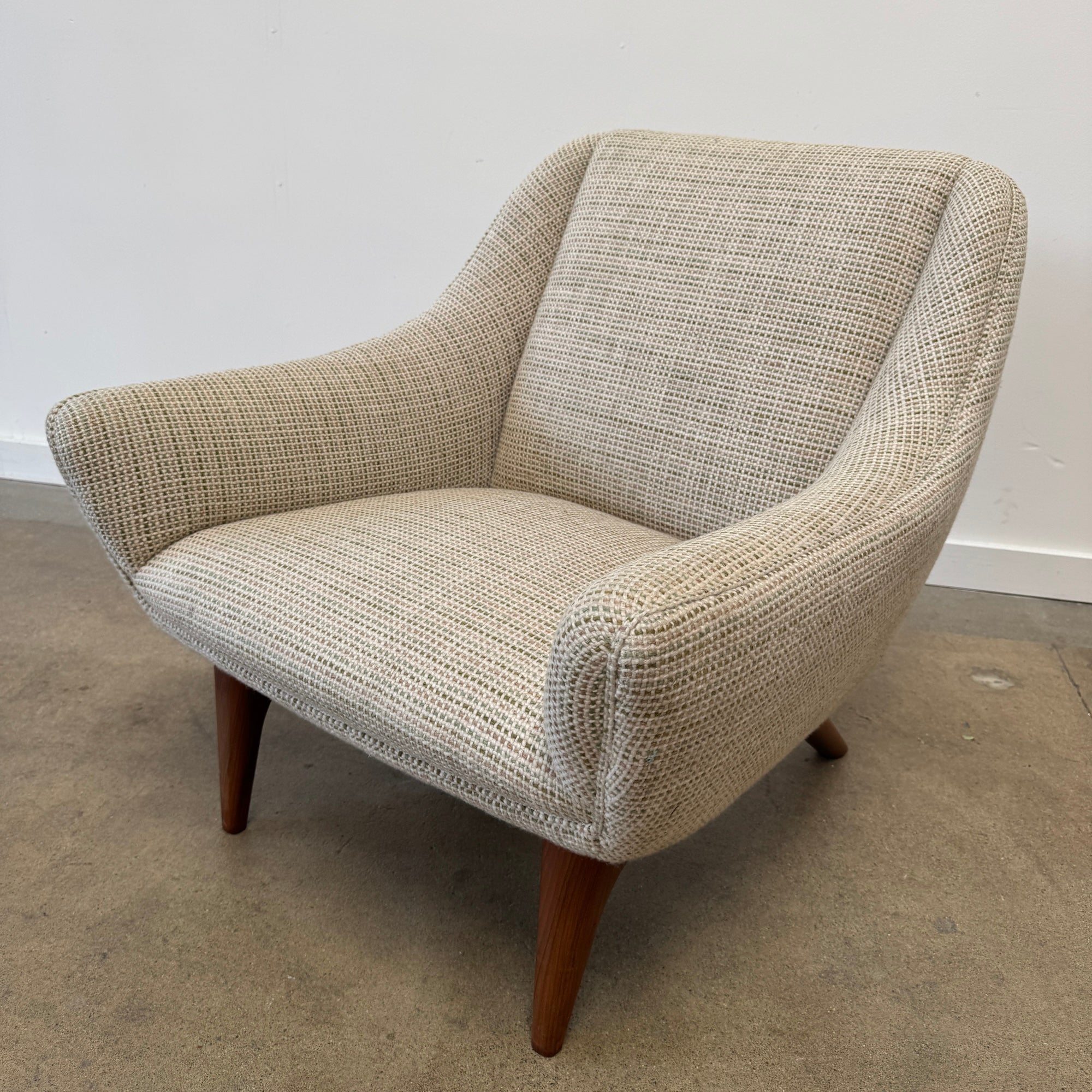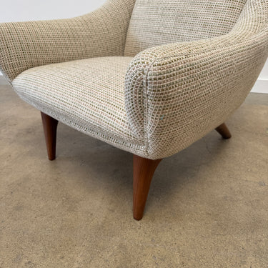 This refined lounge chairs exudes understated elegance, showcasing exceptional craftsmanship and a keen eye for detail—hallmarks of Illum Wikkelsø’s work. Resting on tapered, dark-stained mahogany legs, the design balances sophistication with comfort. The upholstery seat cushions offer a plush seating experience, complemented by the flowing lines of the armrests and the sofa’s impeccable proportions, making it a truly majestic addition to any space. Appears to be reupholstered recently and hence the condition on fabric and foam looks really good. Matching sofa might be available. Amazing multi color chunky boucle fabric. Pleasant to touch with cozy feel and durable. Price is for both chairs.