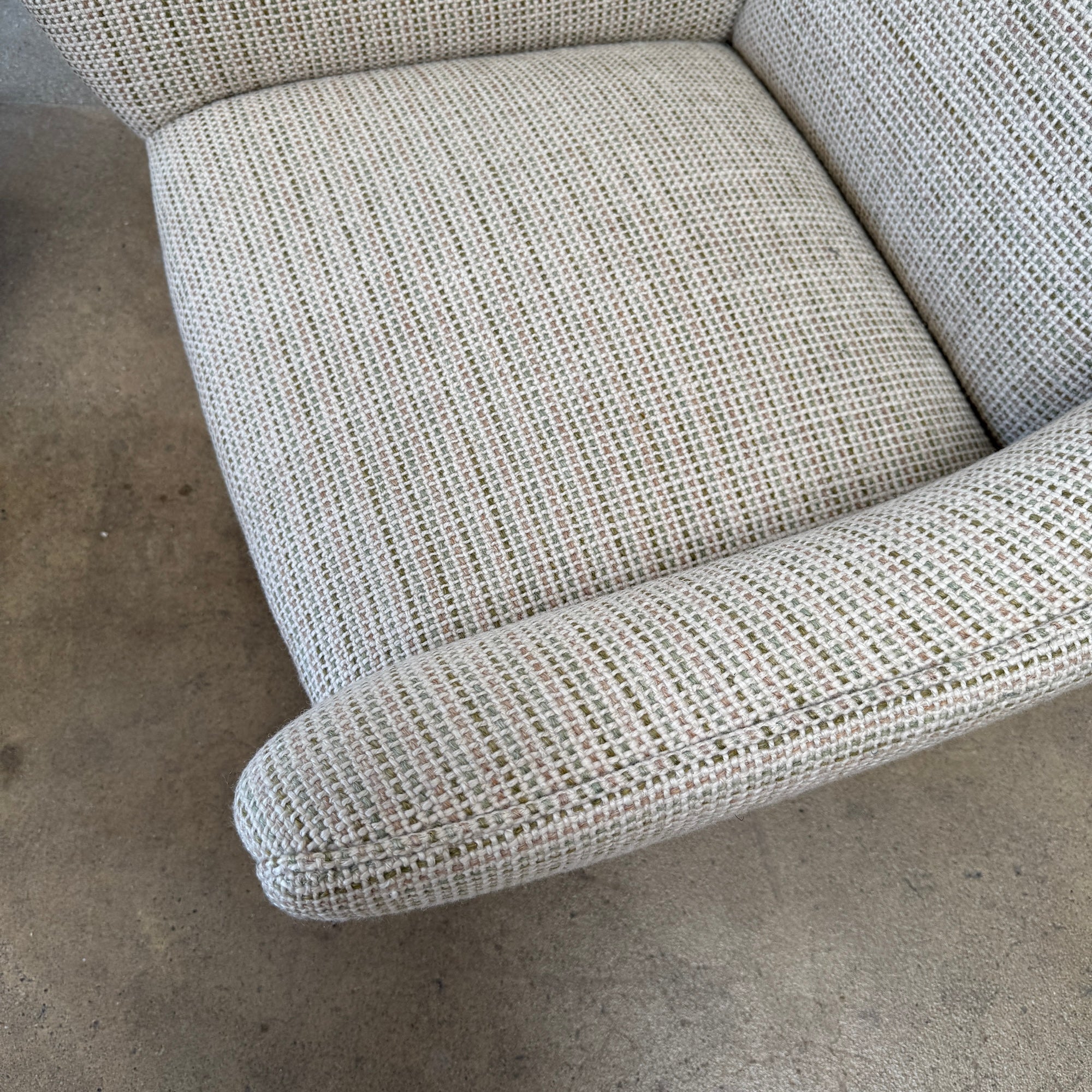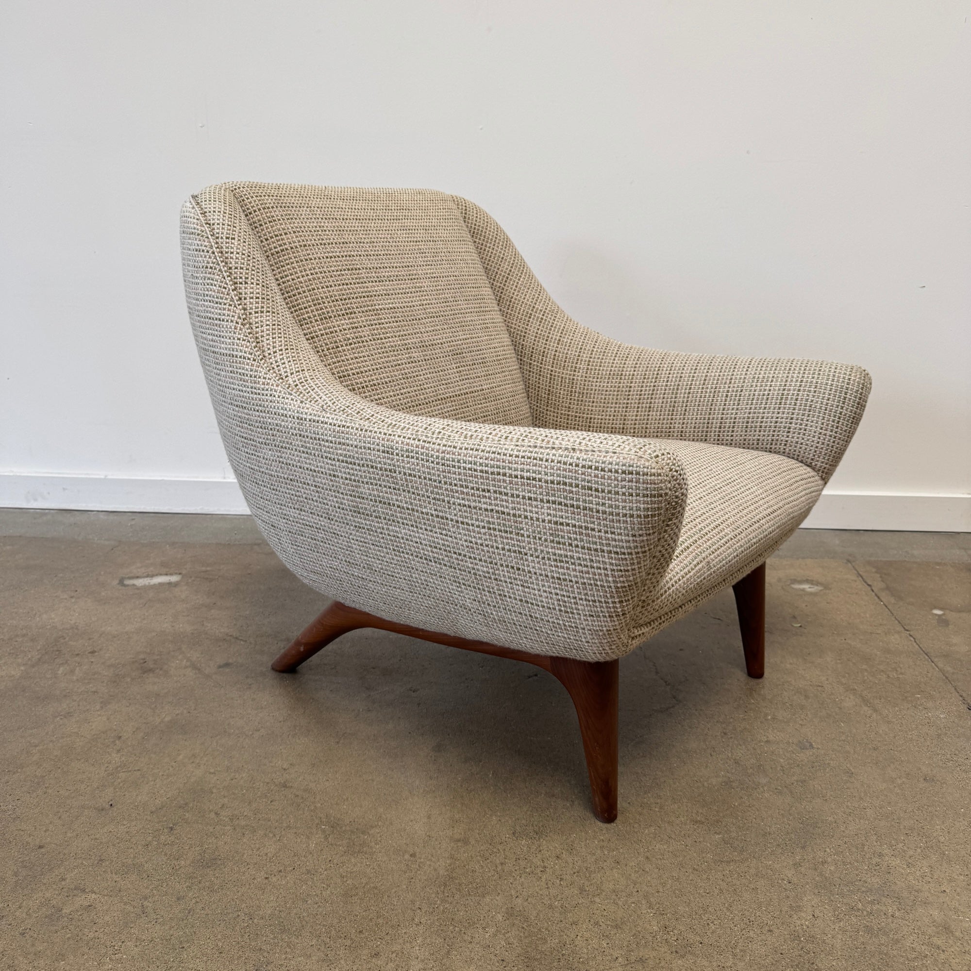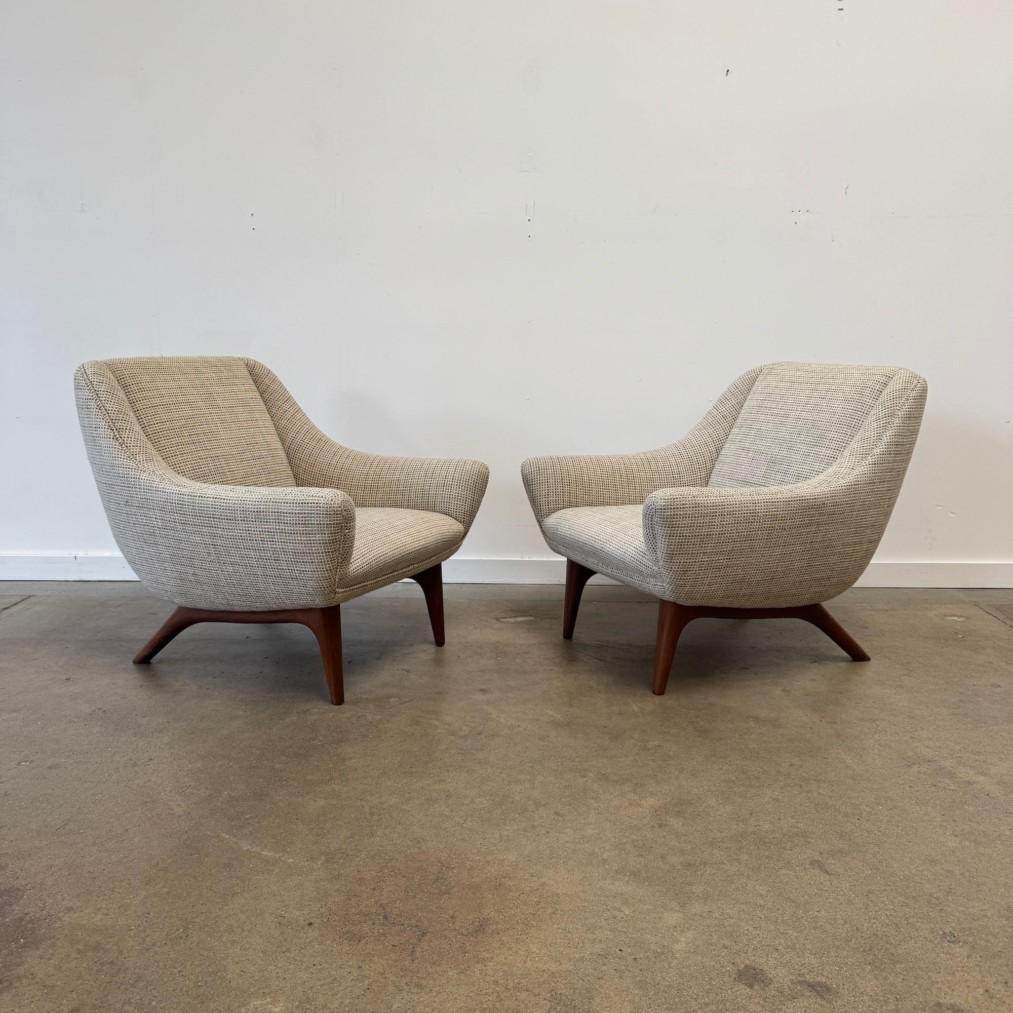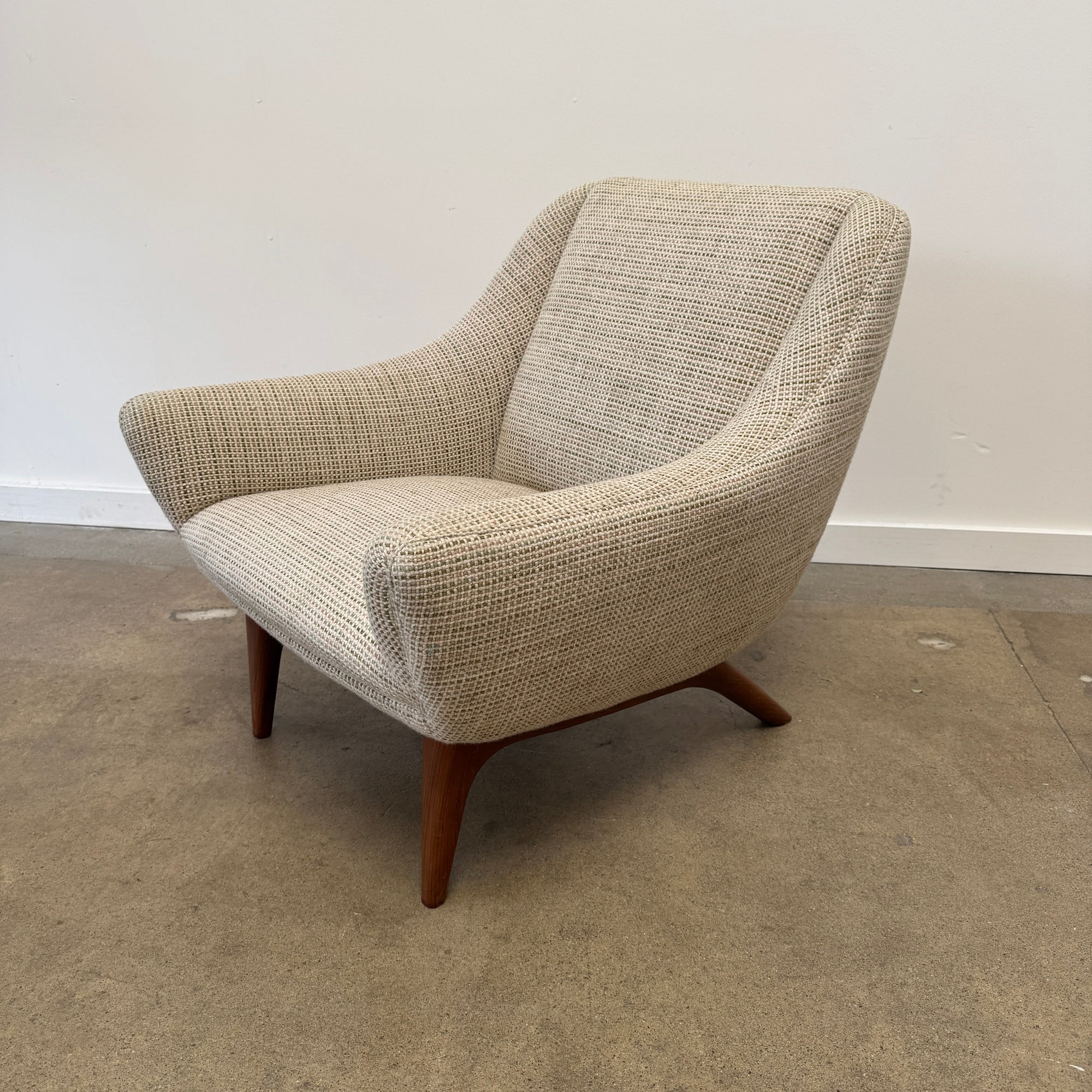 This refined lounge chairs exudes understated elegance, showcasing exceptional craftsmanship and a keen eye for detail—hallmarks of Illum Wikkelsø’s work. Resting on tapered, dark-stained mahogany legs, the design balances sophistication with comfort. The upholstery seat cushions offer a plush seating experience, complemented by the flowing lines of the armrests and the sofa’s impeccable proportions, making it a truly majestic addition to any space. Appears to be reupholstered recently and hence the condition on fabric and foam looks really good. Matching sofa might be available. Amazing multi color chunky boucle fabric. Pleasant to touch with cozy feel and durable. Price is for both chairs.