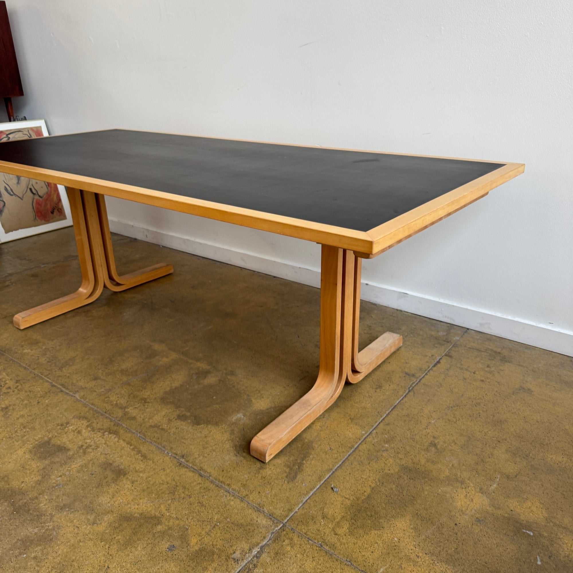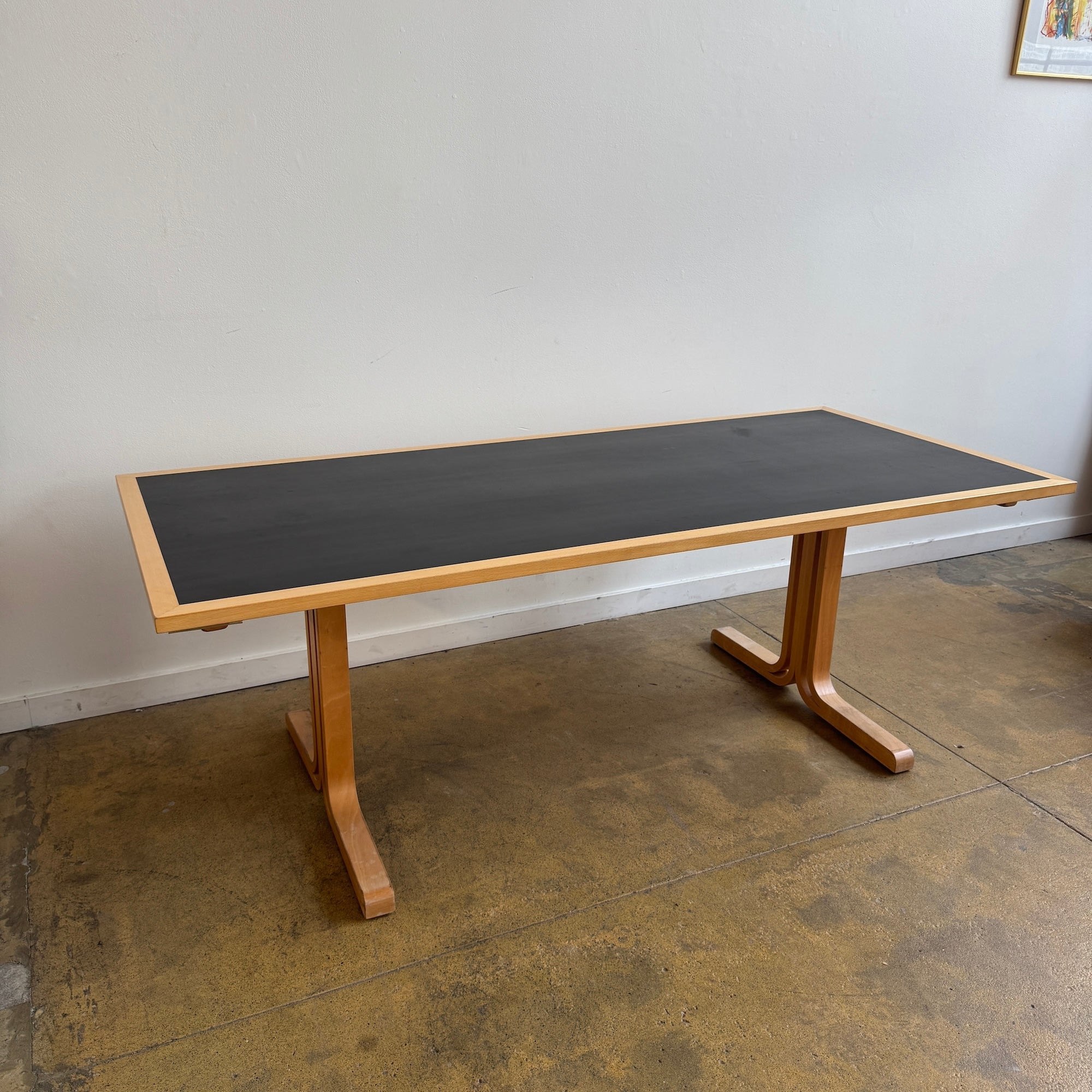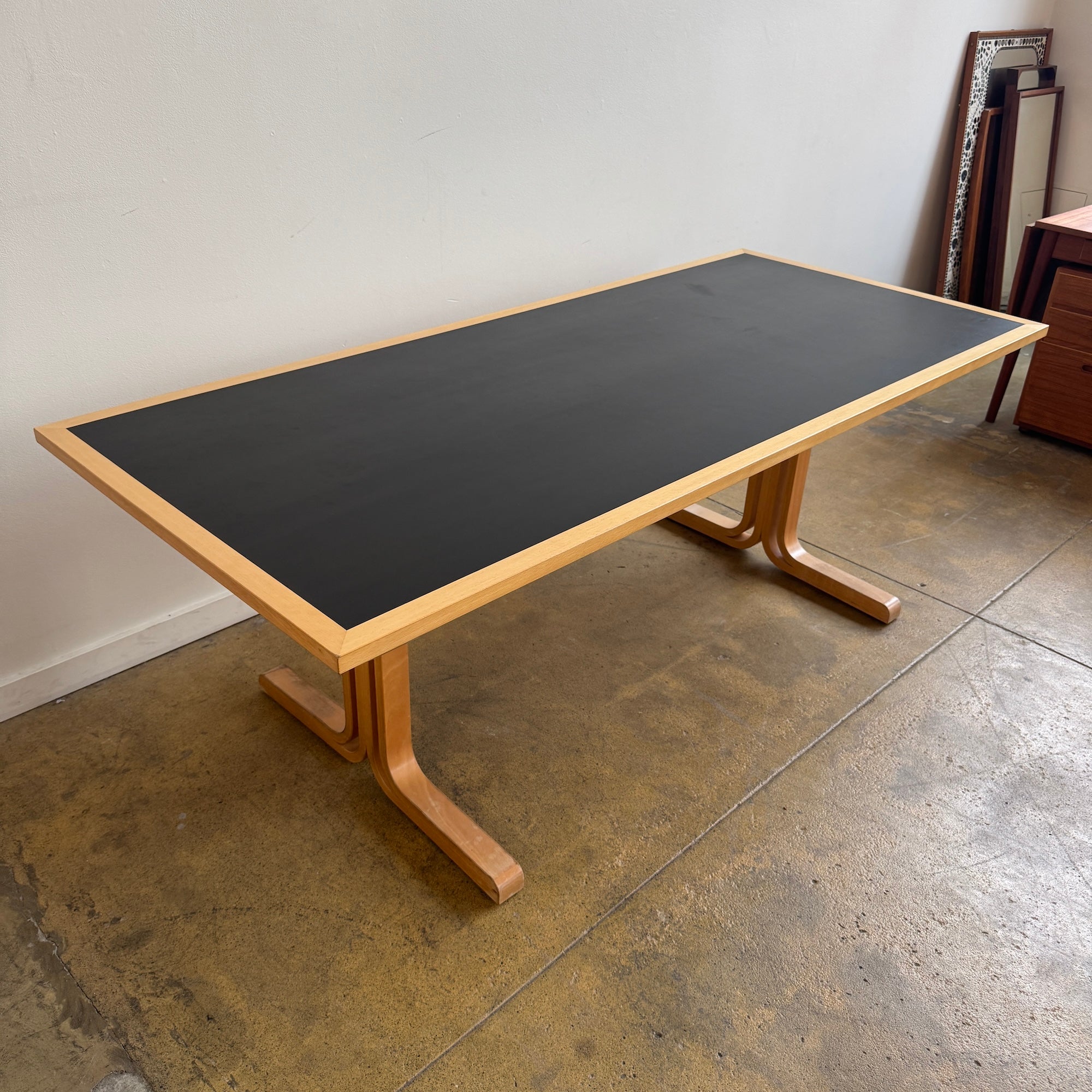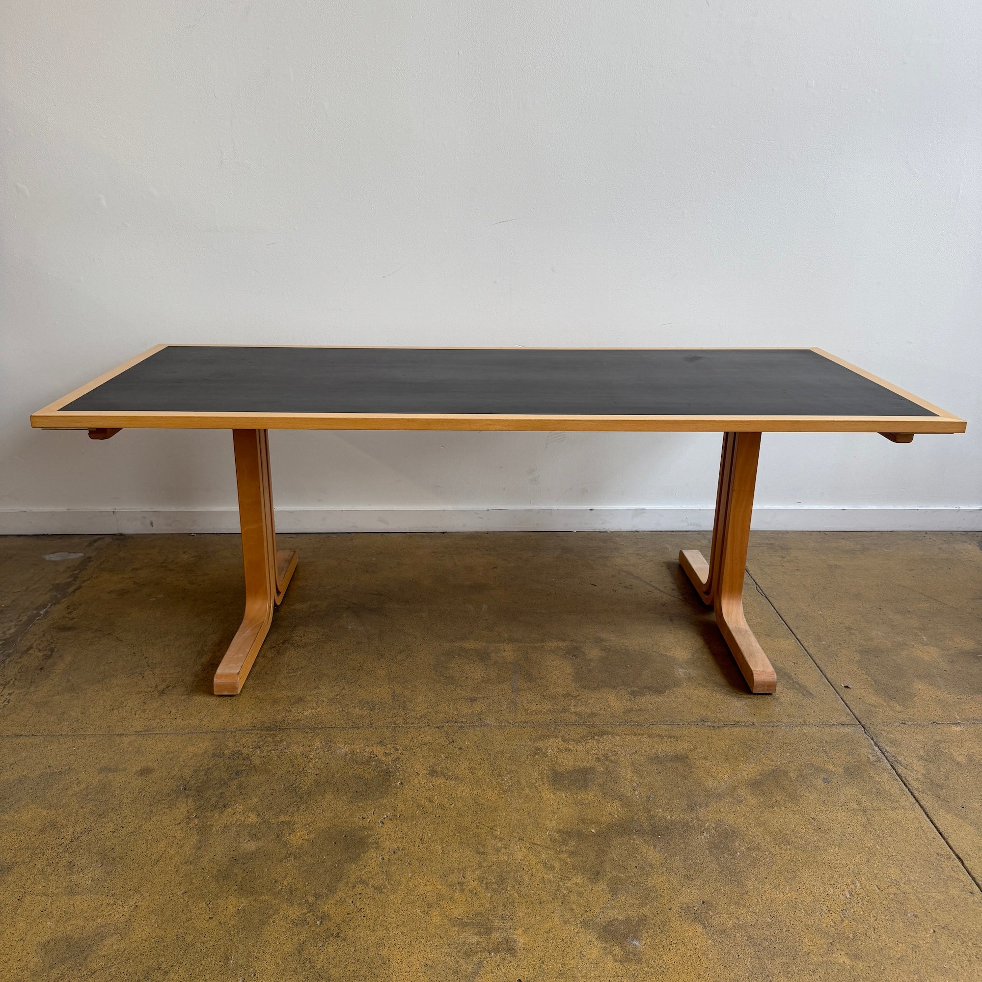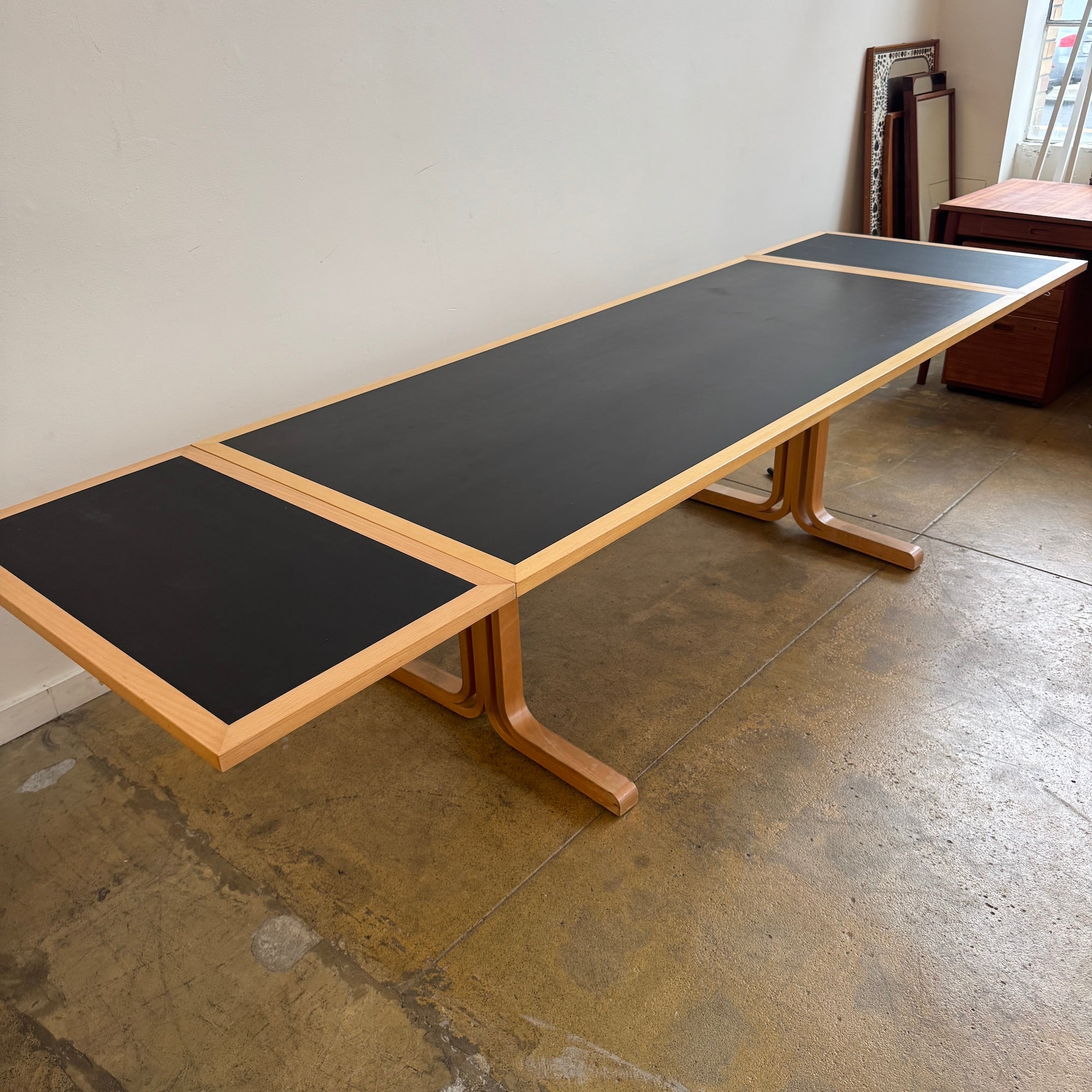 A versatile modular table designed by Magnus Olesen, offering both elegance and practicality. Constructed with a honeycomb tabletop for strength and lightness, the table is finished with a striking black laminate surface framed in beechwood. The bentwood sled legs provide stability while maintaining a clean, modern Scandinavian aesthetic.