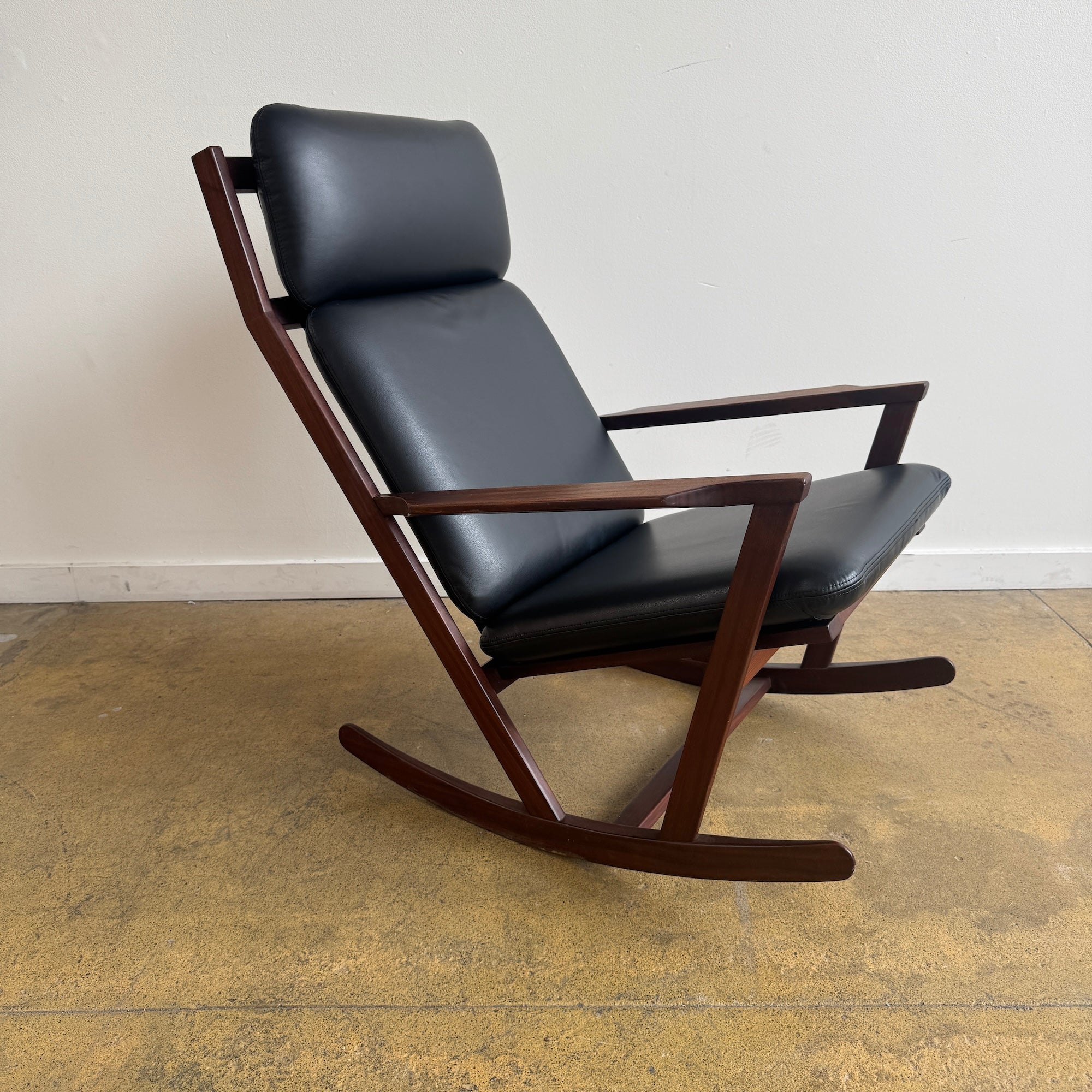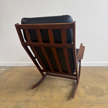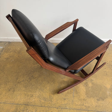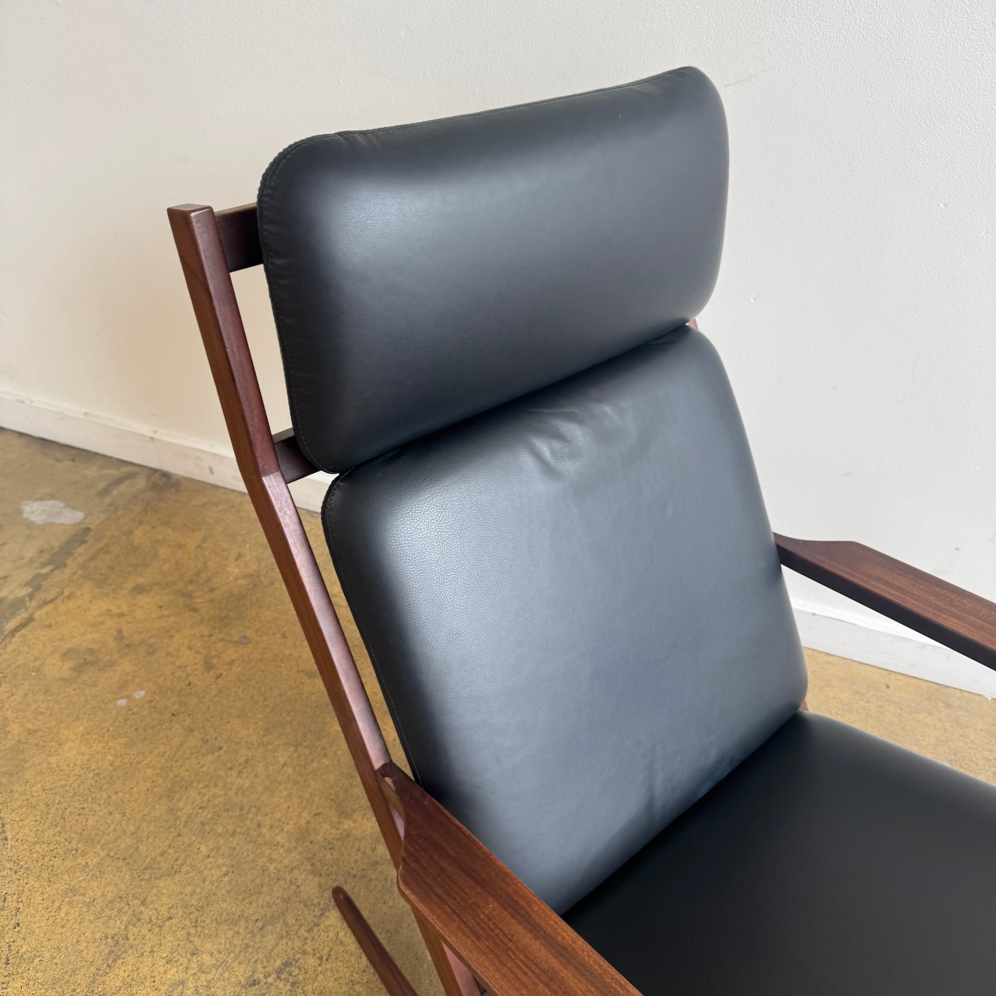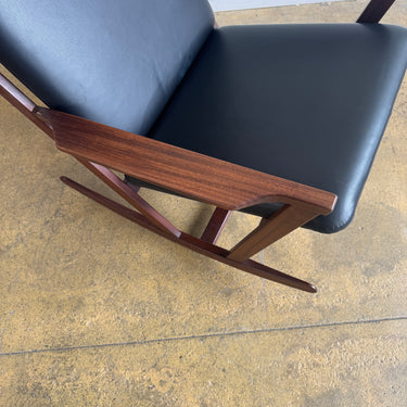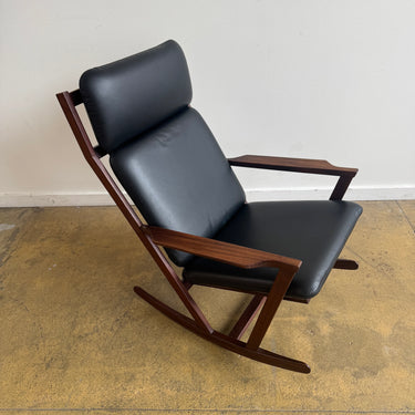 A stunning example of Danish modernism, this vintage rocking chair by Poul Volther for Frem Røjle blends refined craftsmanship with sculptural elegance. The frame is constructed from rich, dark-stained hardwood with beautifully angular lines and gently curved runners. The chair features recently upholstered high-density cushions in sleek black leatherette, offering excellent back and neck support for long lounging sessions.