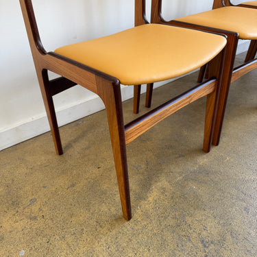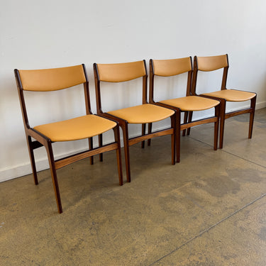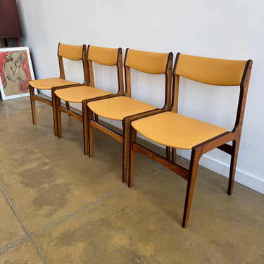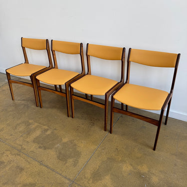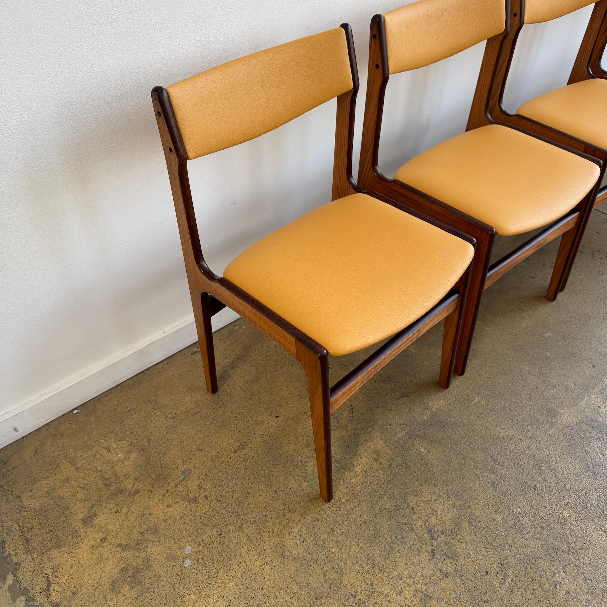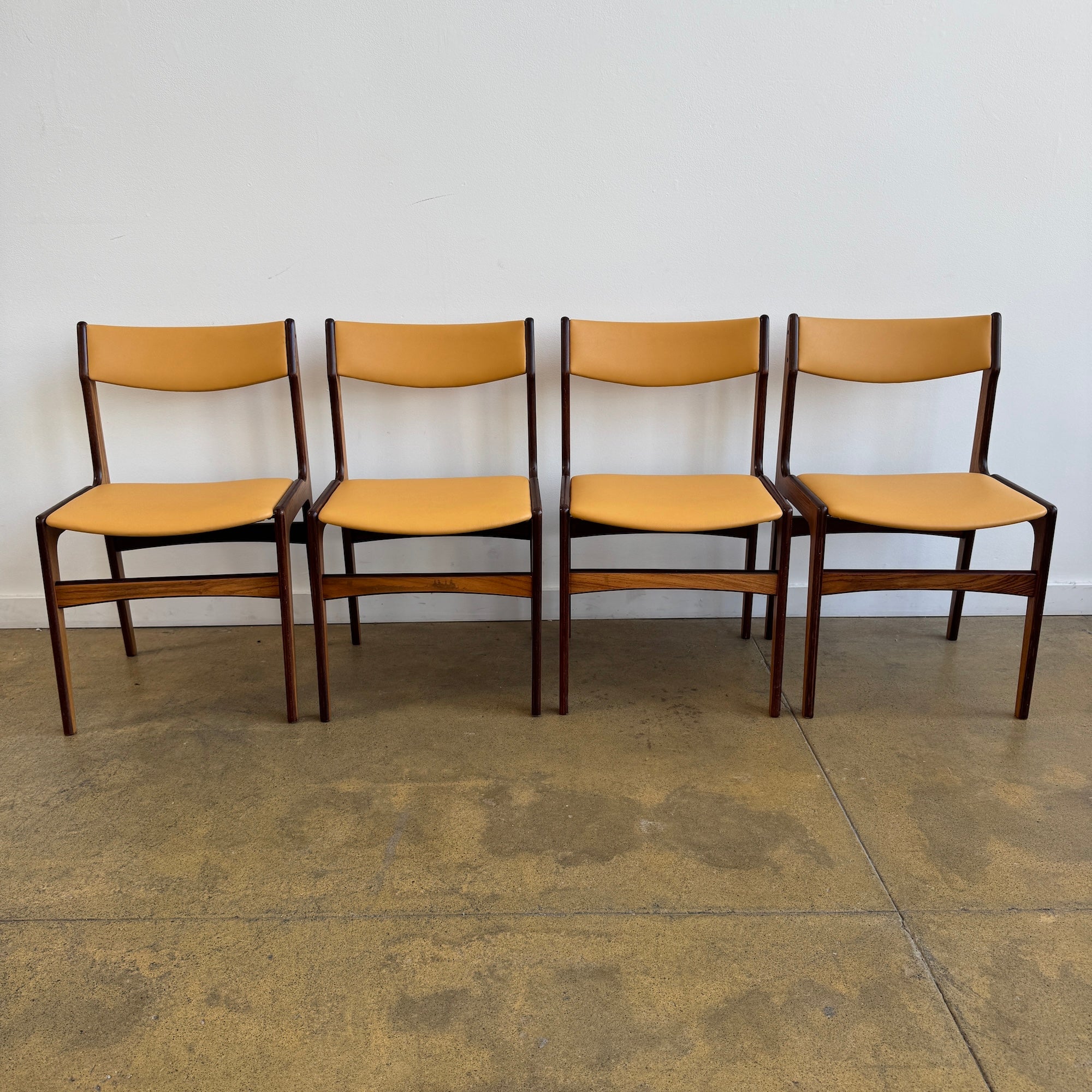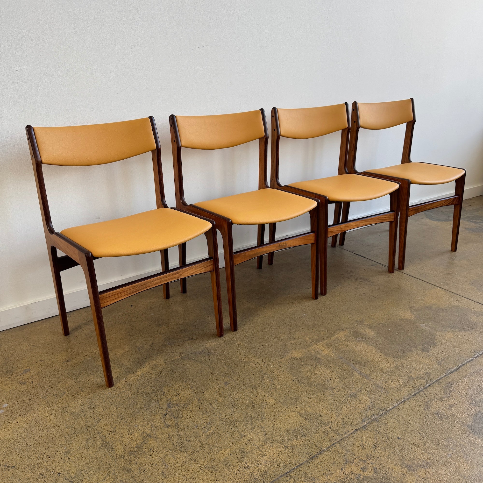This set of 4 dining chairs was designed by Erik Buch for Anderstrup Stolefabrik. Recently reupholstered with high quality Knoll leather fabric. Rosewood Frame in really good condition. Lightly refinished and sealed.