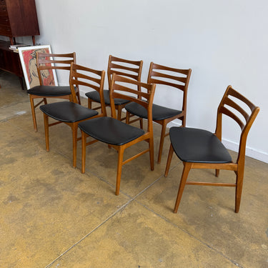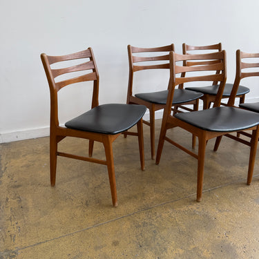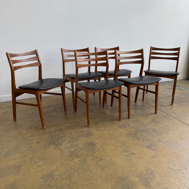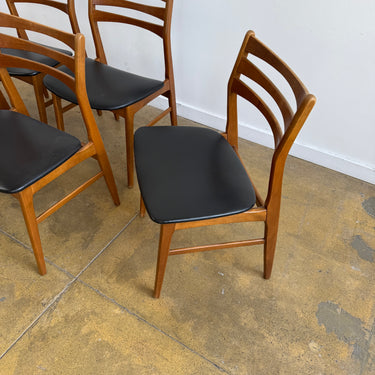 A well-crafted set of six dining chairs by Skovby, designed and produced in Denmark during the 1960s. The solid teak frames feature a sculpted ladder-back design, offering both elegance and comfort. Seats are upholstered in black vinyl, providing a sleek contrast to the warm wood grain and ensuring easy maintenance.