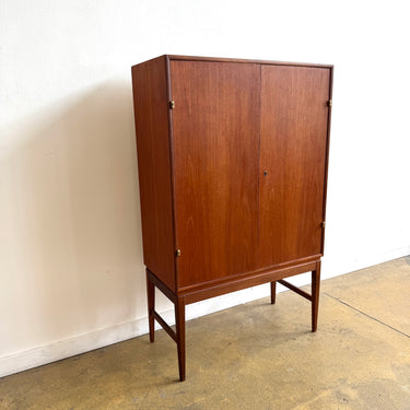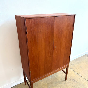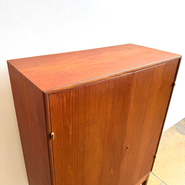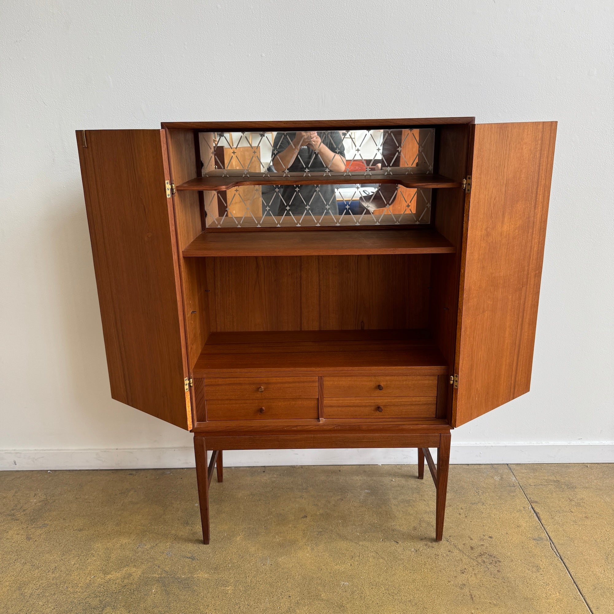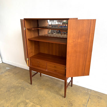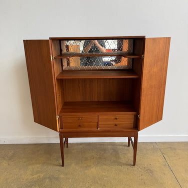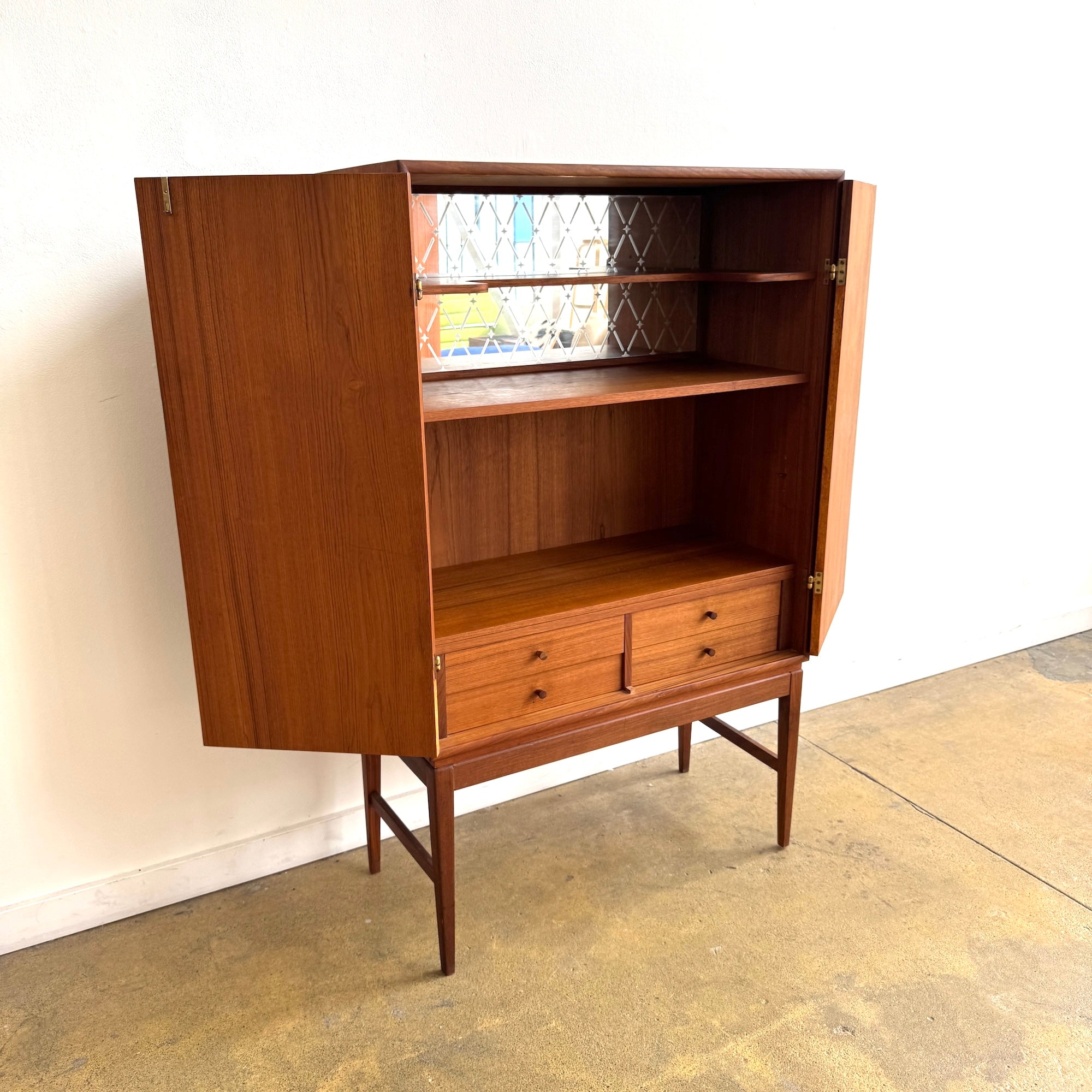 A beautifully crafted Danish Modern bar cabinet in teak. Clean lines, warm tone, and elegant proportions make this piece a versatile addition to any space. Behind the double doors, the cabinet reveals shelving, two drawers, and a mirrored back with diamond-patterned detail — perfect for glassware and entertaining essentials.