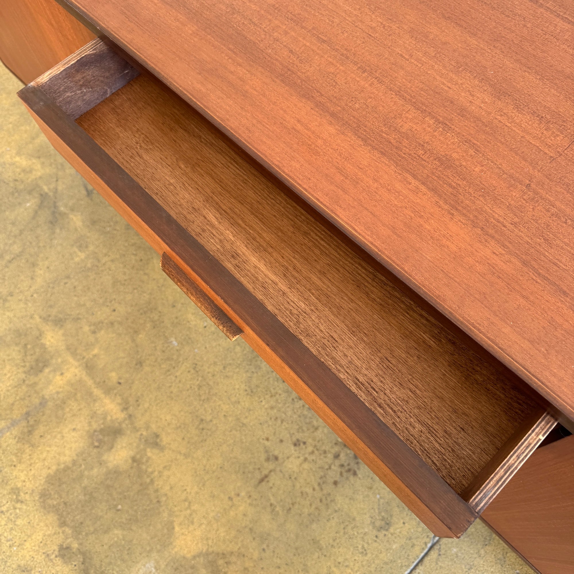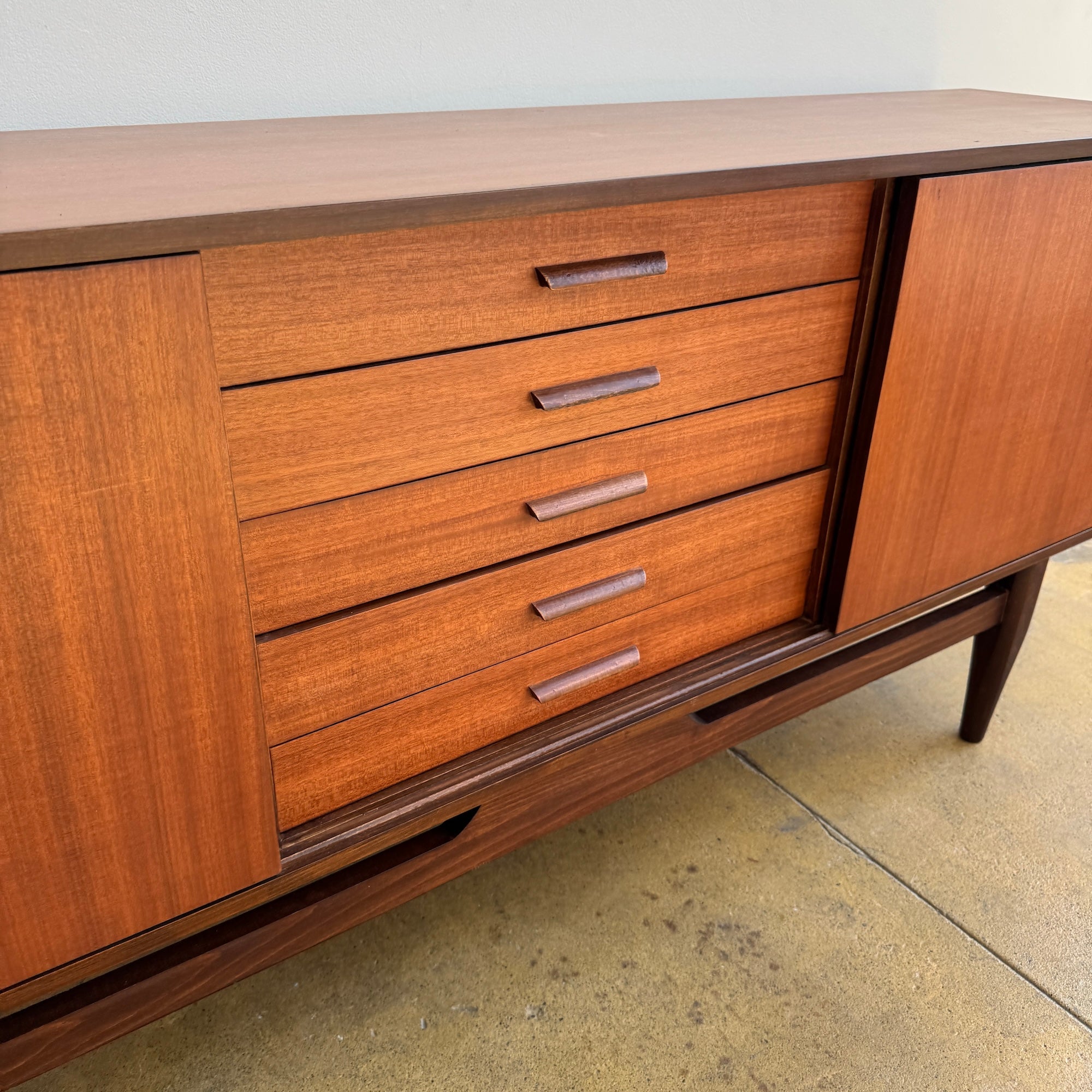 Vintage Danish credenza in teak wood, featuring clean lines and elegant proportions. The piece offers a functional layout with five center drawers flanked by two cabinet doors, all set on a sculpted base with subtly tapered legs. A timeless example of mid-century modern craftsmanship, perfect for dining, living, or office spaces. In good vintage condition with minor signs of wear consistent with age.