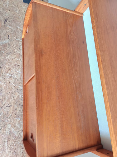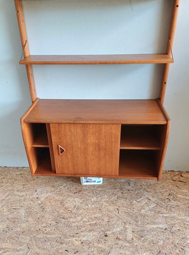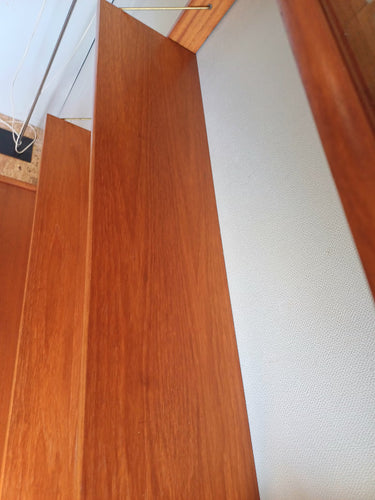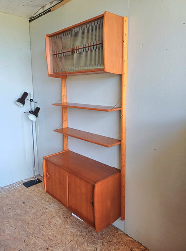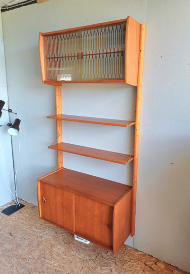 Danish vintage teak wall unit with clean Scandinavian lines. Features sliding glass doors with a decorative pattern, two open shelves, and a lower cabinet with sculpted handles. Ideal for displaying and storing books, ceramics, or everyday essentials. Beautiful teak grain throughout with warm patina. Appears to be in good vintage condition.