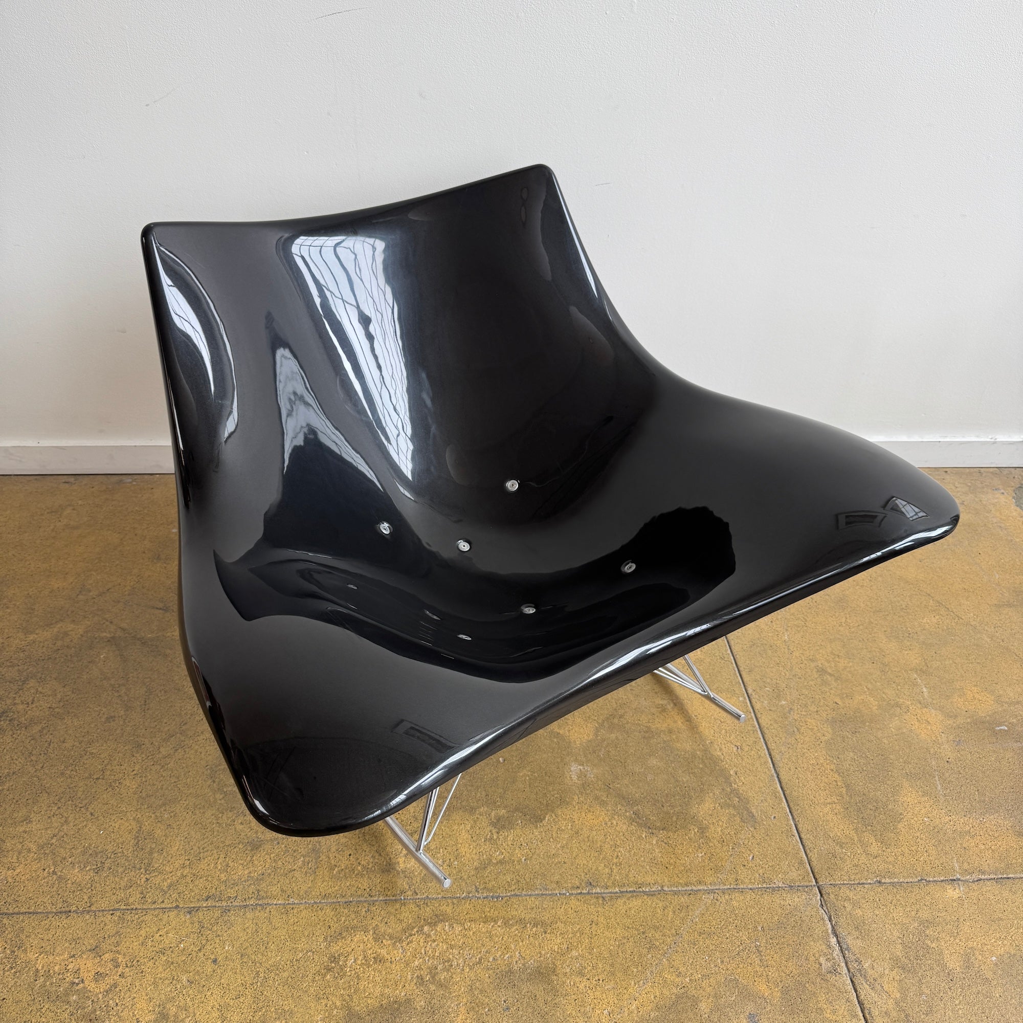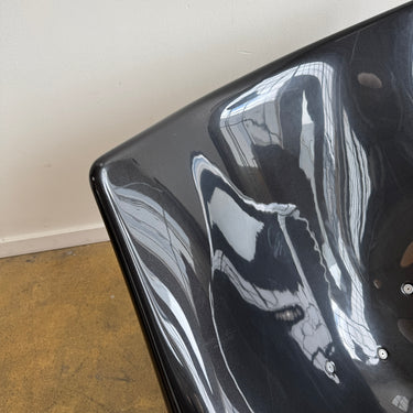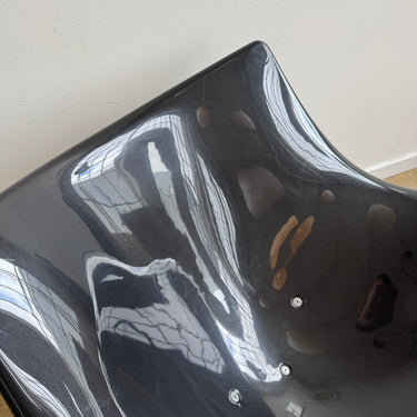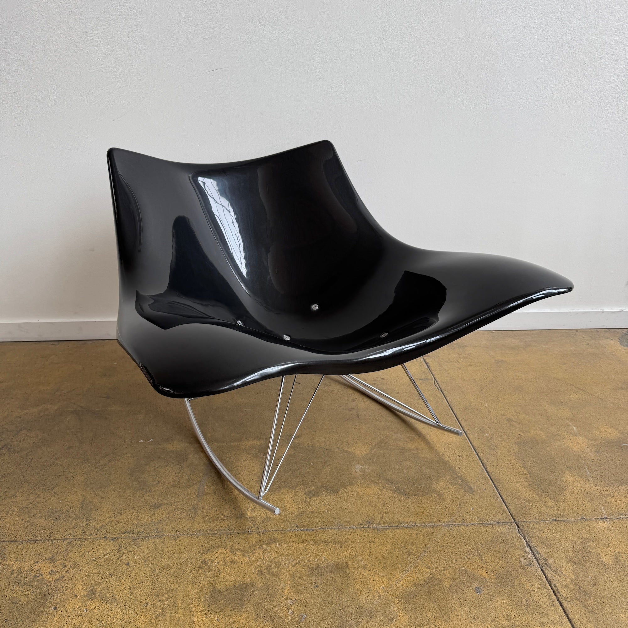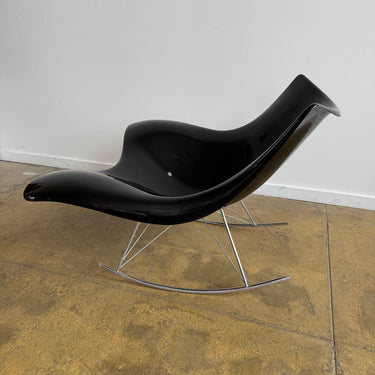This example features a sleek black plastic shell with a stainless steel wire base, balancing modern minimalism with organic fluidity. The generous seat and flowing lines provide exceptional comfort, while the rocking motion enhances relaxation.