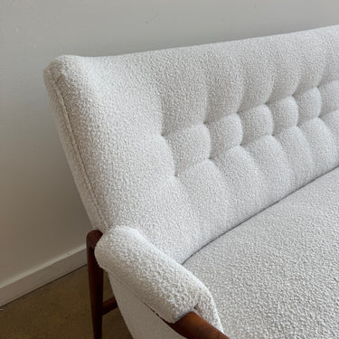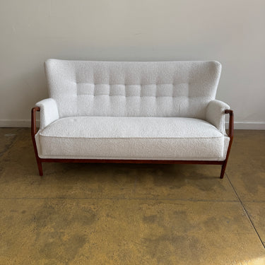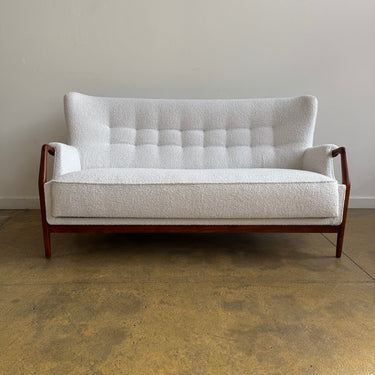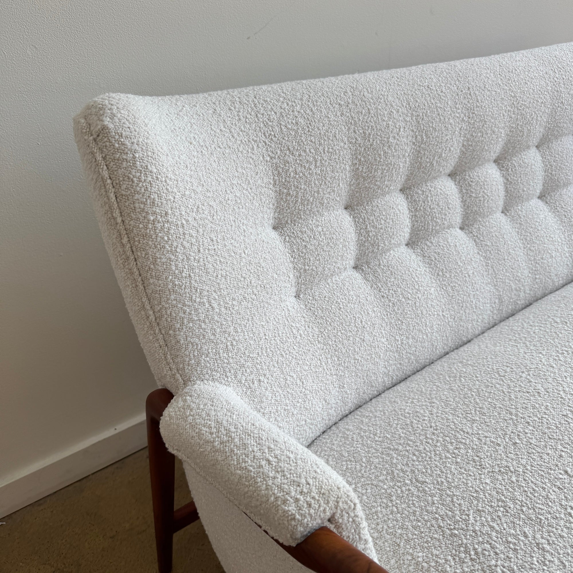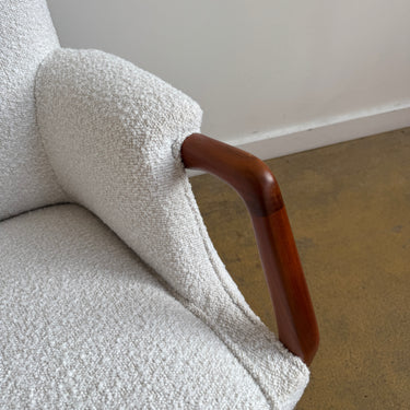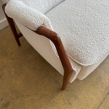 Designed by Danish architect Kurt Olsen, the Model 214 unites refined craftsmanship with elegant mid-century modern design. The stained beech frame features Olsen’s signature angled arms that flow seamlessly into the legs, giving the piece both strength and lightness. Upholstery and frame engage beautifully at the armrests, highlighting the precision of the design. Newly upholstered in Robert Allen boucle with a refinished frame. Rare. Matching armchair also available.