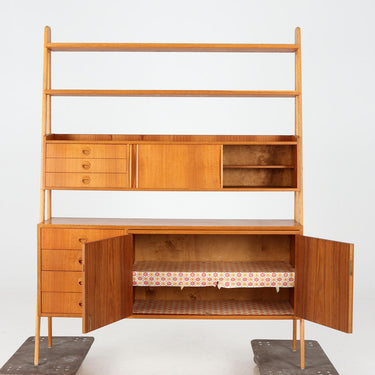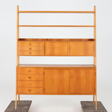 Elegant and highly functional freestanding shelving unit by AB Svenska Ramfabriken, Malmbäck, Sweden, dating to the 1950s. Crafted in warm teak with beech supports, this versatile piece combines open shelving with generous storage. The unit features four drawers and a two-door cabinet on the lower section, paired with additional drawers and sliding-door compartments above. Two open display shelves complete the structure, making it perfect for books, ceramics, or decorative objects.
