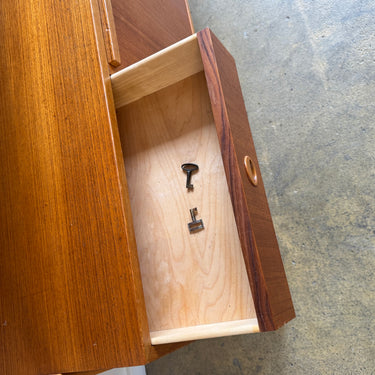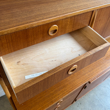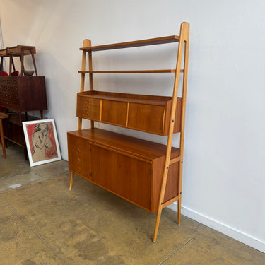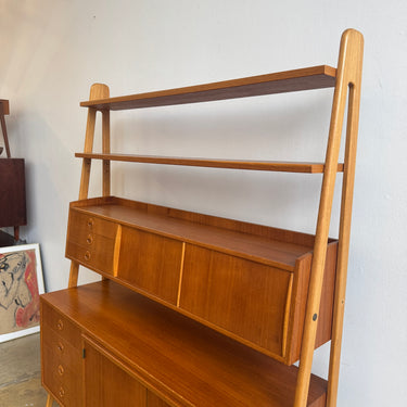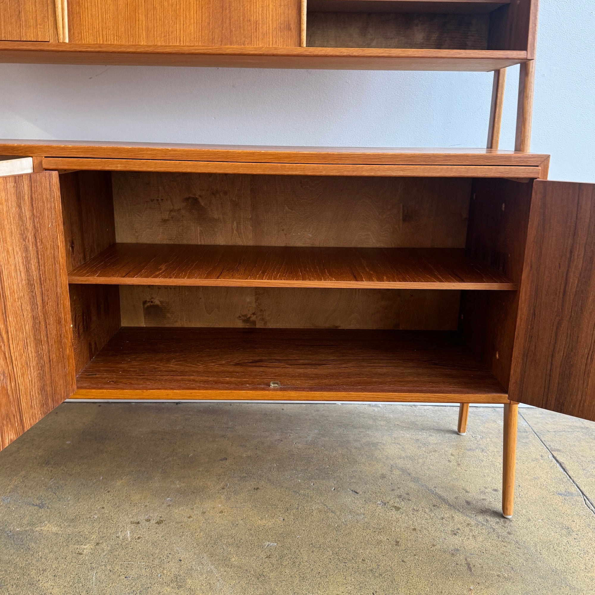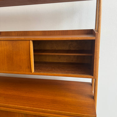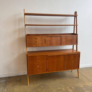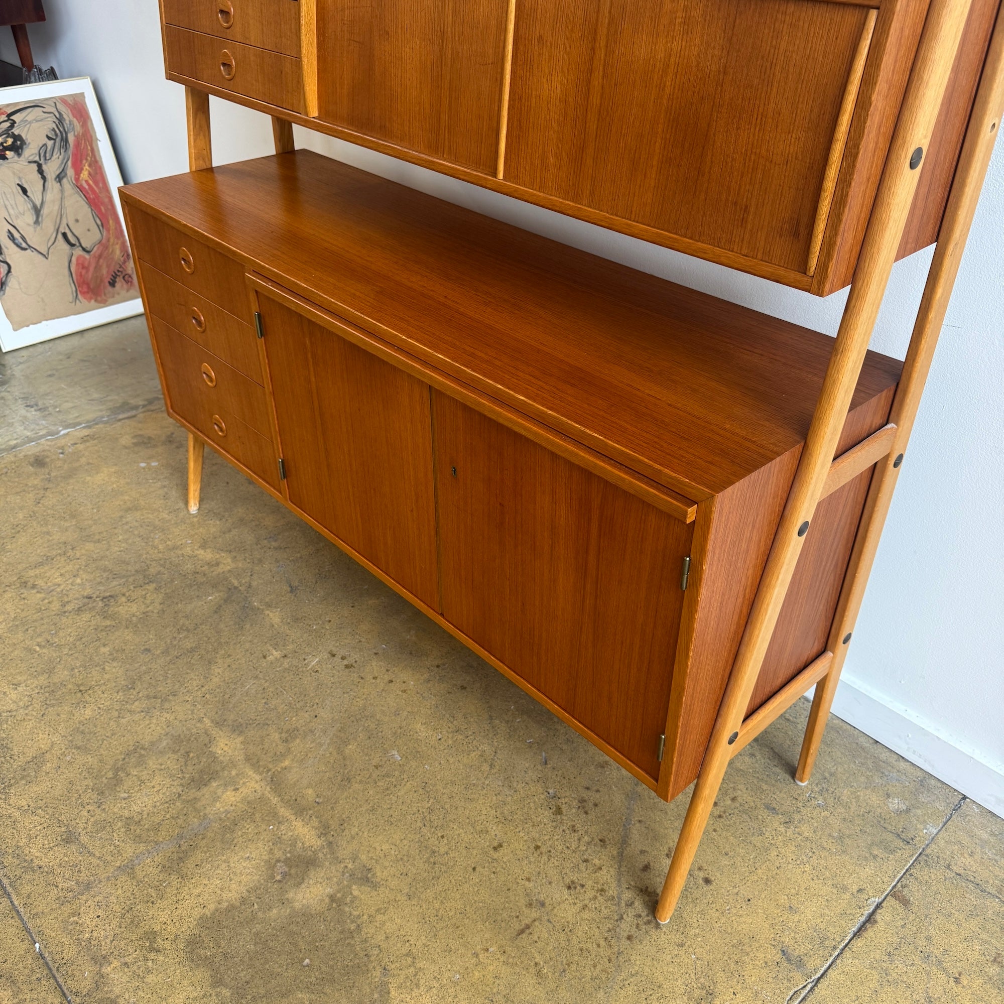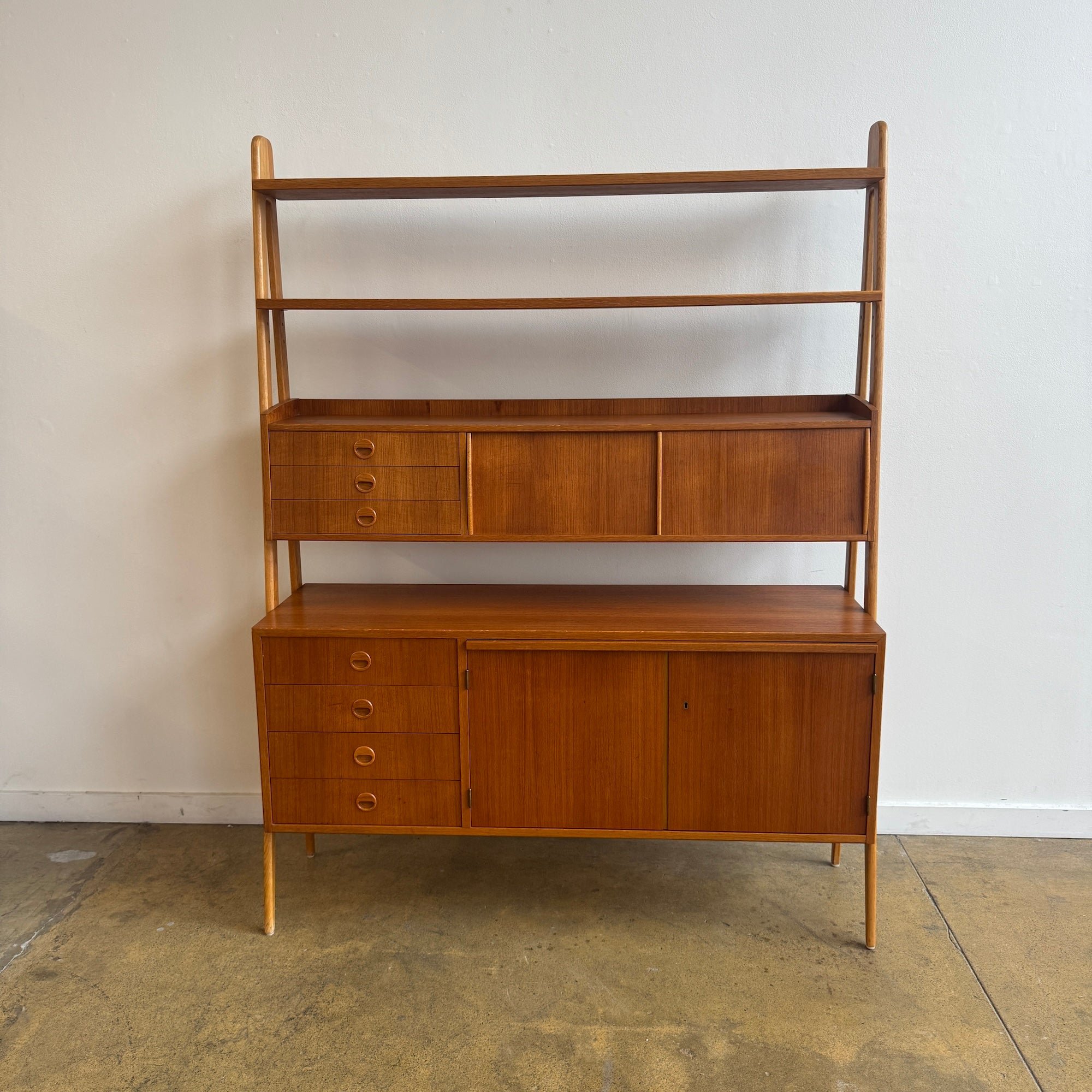 Elegant and highly functional freestanding shelving unit by AB Svenska Ramfabriken, Malmbäck, Sweden, dating to the 1950s. Crafted in warm teak with beech supports, this versatile piece combines open shelving with generous storage. The unit features four drawers and a two-door cabinet on the lower section, paired with additional drawers and sliding-door compartments above. Two open display shelves complete the structure, making it perfect for books, ceramics, or decorative objects.