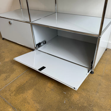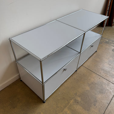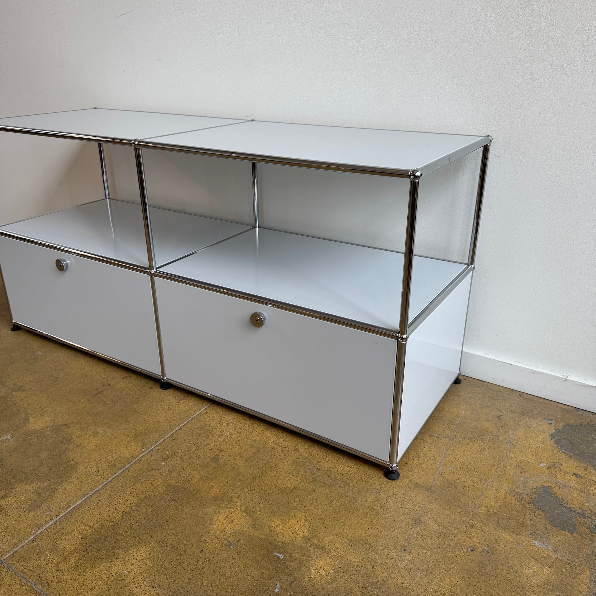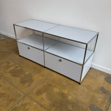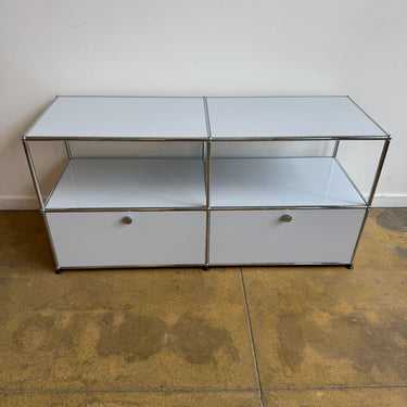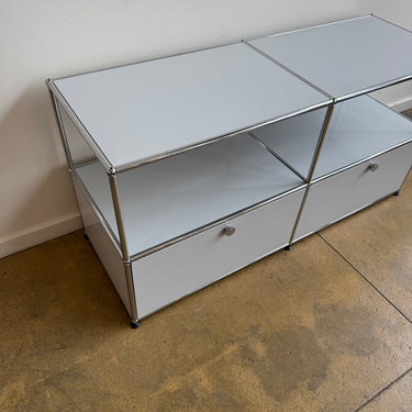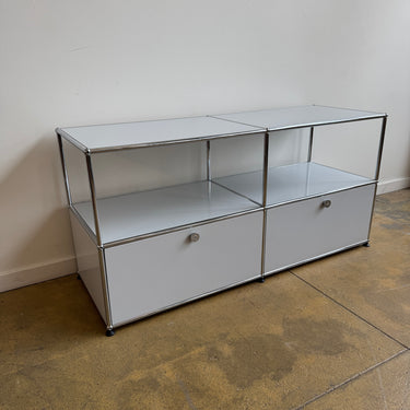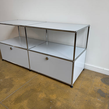 This USM Haller console is in good condition. The two upper unit is left open with two drop down closed door. Some light scuffs here and there.
