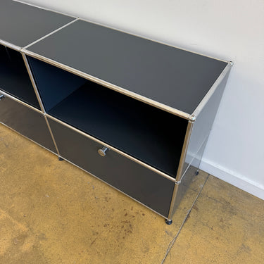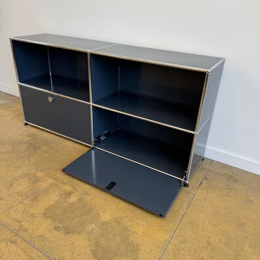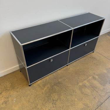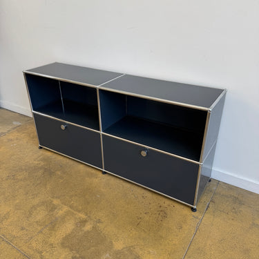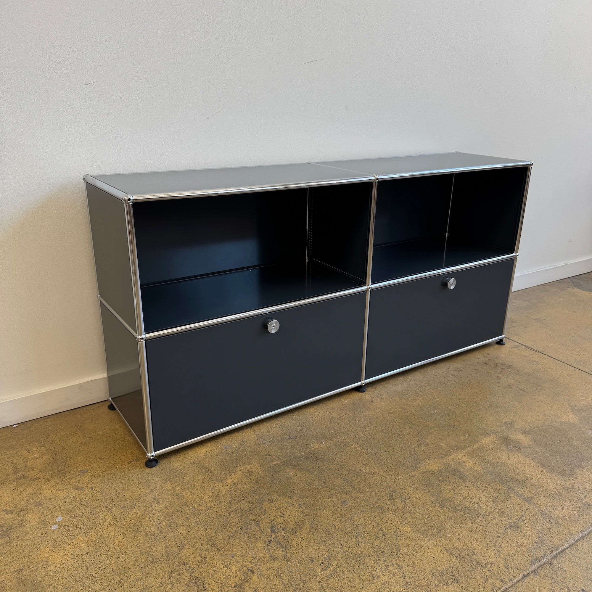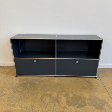This USM Haller console is in good condition. The two upper unit is enclosed with two drop down closed door. Some tiny light scuffs here and there.