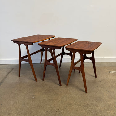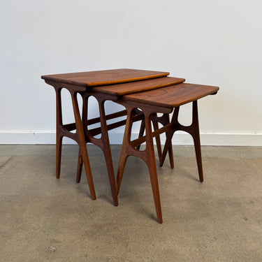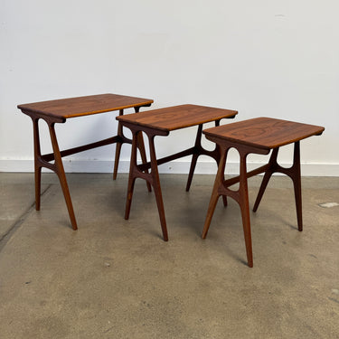 Set of three nesting tables designed by Johannes Andersen for CFC Silkeborg. Crafted from richly grained teak, these sculptural tables feature Andersen’s signature organic lines and architectural leg detailing.