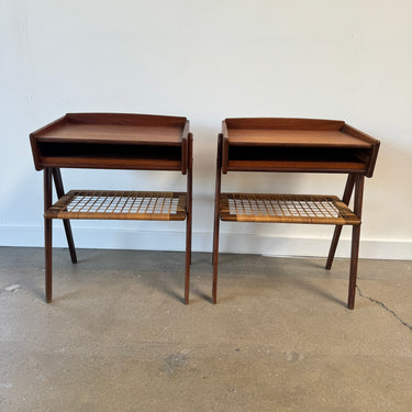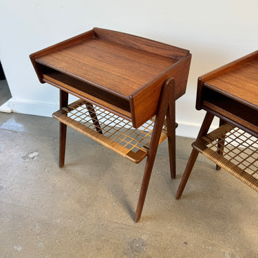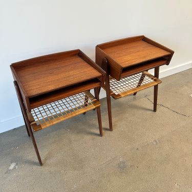 This elegant set of two teak nightstands features a unique V Leg shape and a cane layer for added storage. Crafted from high-quality teakwood, these nightstands are in excellent vintage condition with no signs of damage. The price includes both pieces for a complete set.