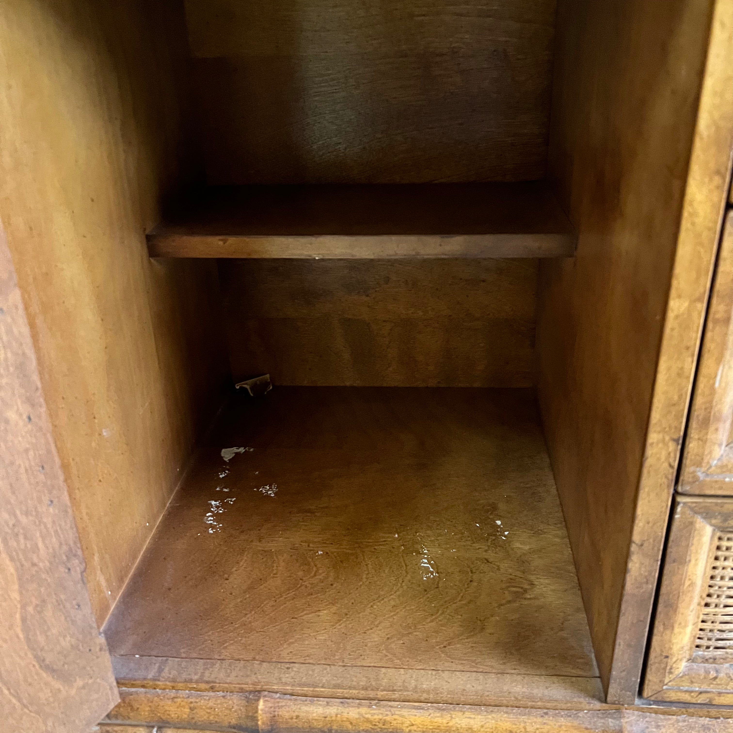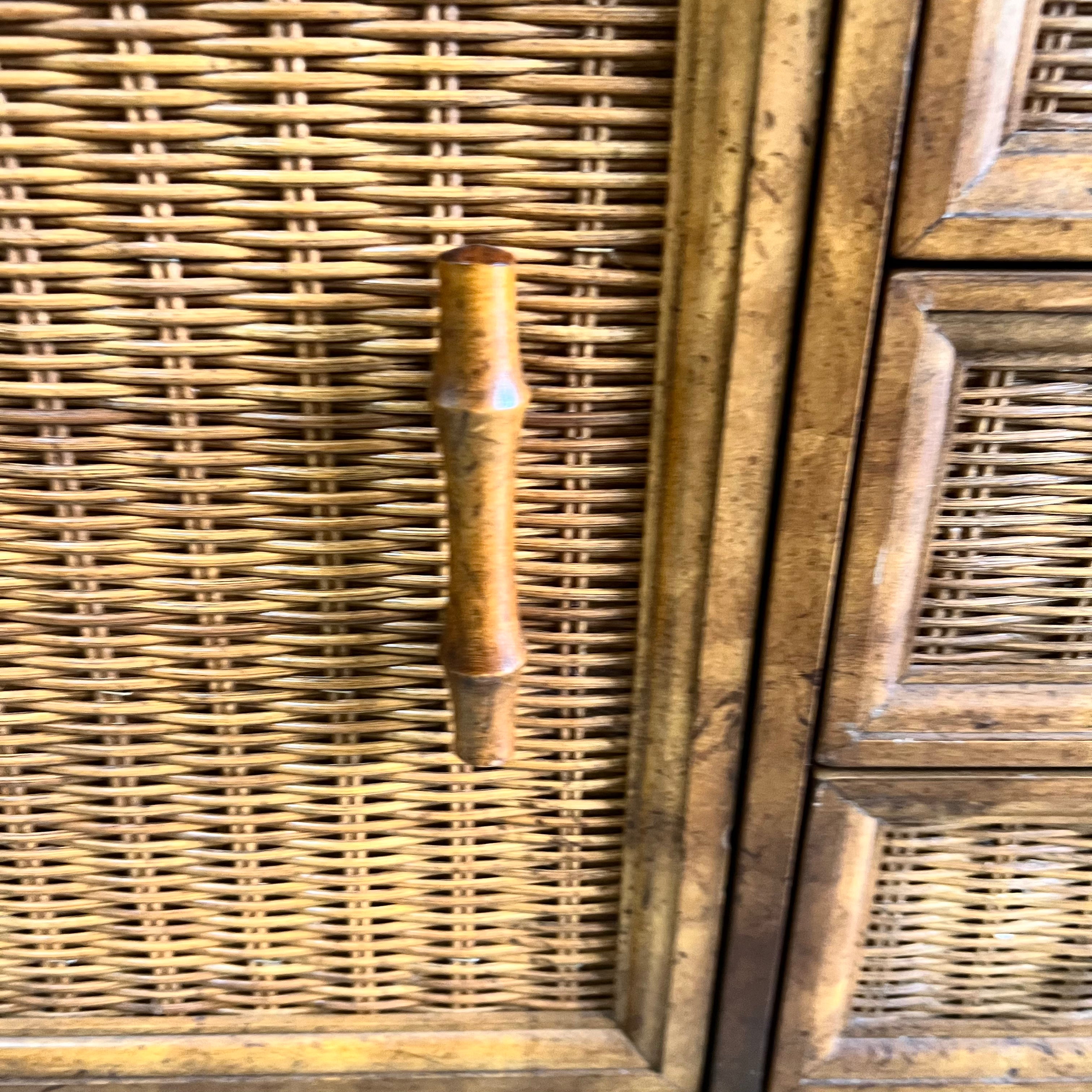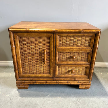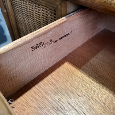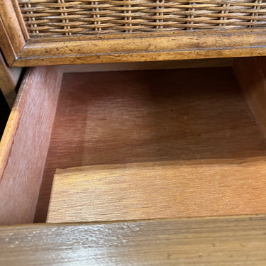 vintage American of Martinsville nightstands feature faux bamboo, rattan wicker, 3 dovetailed drawers & storage cabinet. They are in very good vintage condition with some scuffs and imperfections from normal wear. They are ready to be enjoyed in their original wooden finish or they make great pieces to paint or lacquer.