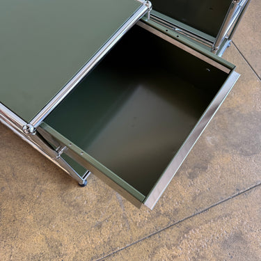 The USM HALLER Media Console was created in 1963 by Swiss architects Fritz Haller and Paul Schaerer. It features custom-made powder-coated steel panels and chrome tubes, providing long-lasting durability that can span generations.