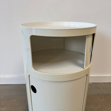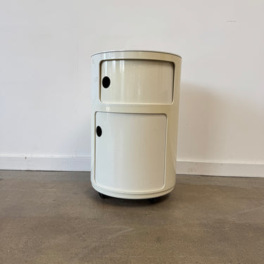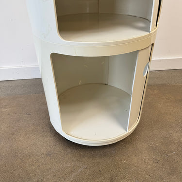 Rare Componibili storage column by Anna Castelli Ferrieri for Kartell. This off-white, two-tier unit sits on smooth-rolling casters and features Ferrieri’s signature curved slide doors—an early, harder-to-find version of the series. Lightweight, fully modular, and easy to move, it slips effortlessly into any room while delivering unmistakable space-age style. Removable recessed tray on top. Refer third photo. Clean and structurally sound with only light vintage wear; wheels operate perfectly. Two matching available. Price is per.