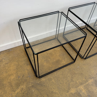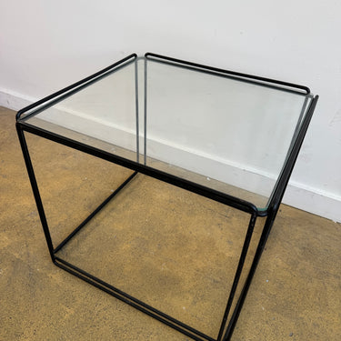 The Max Sauze 'Isosceles' end table features a glass top and a distinctive graphic line art design, crafted by Atrow. While the glass top may not be original, the frame remains in good condition with minor surface marks. The glass surfaces show some scratches, reflecting typical wear.