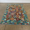 Vibrant and richly patterned handwoven kilim wool rug in classic Swedish style, featuring bold diamond motifs and a dynamic color palette of reds, blues, oranges, and greens. This flatweave showcases traditional geometric precision with modern appeal, bordered by a colorful stepped frame design.