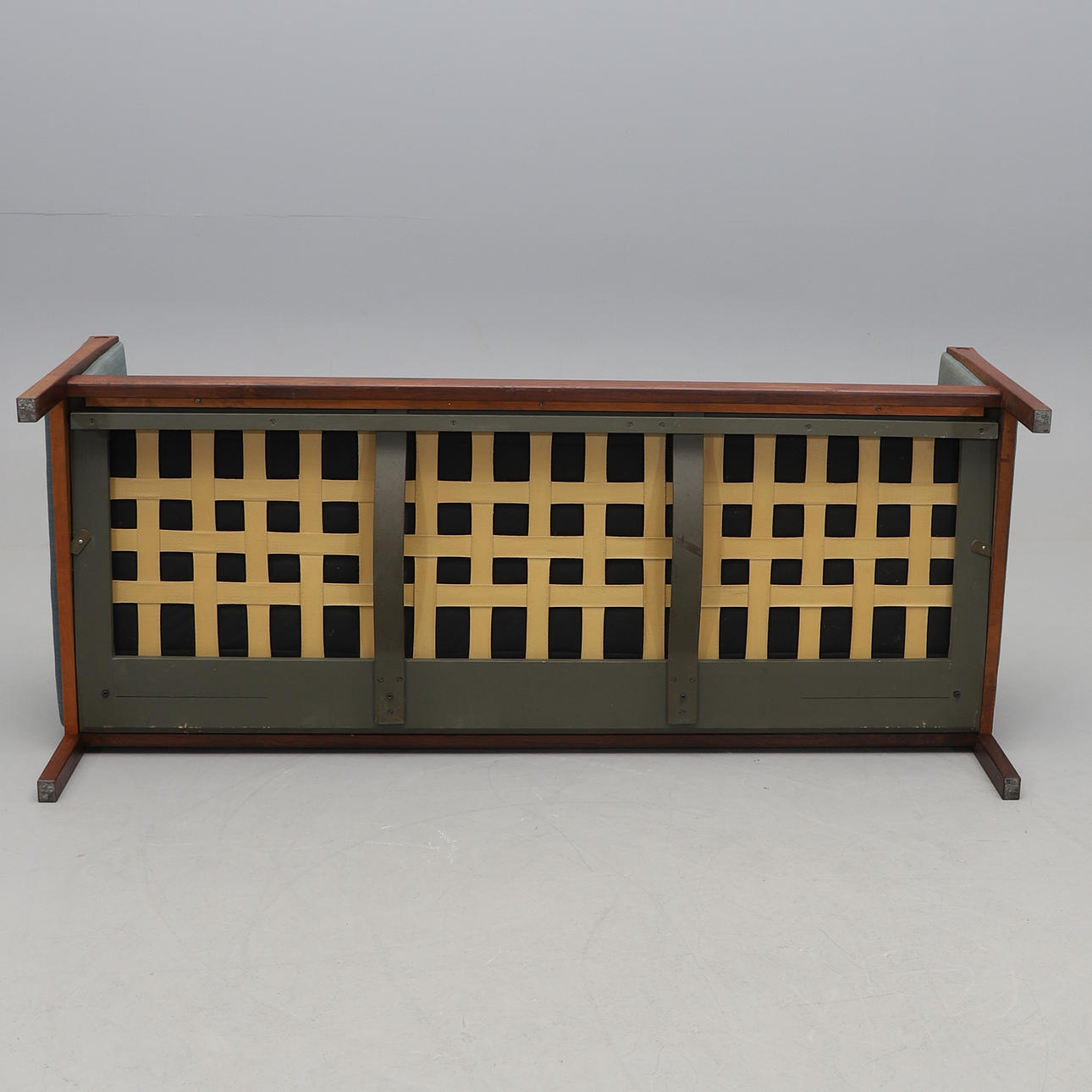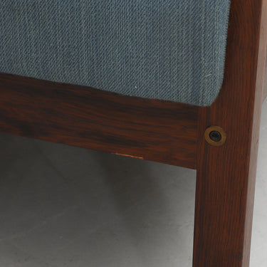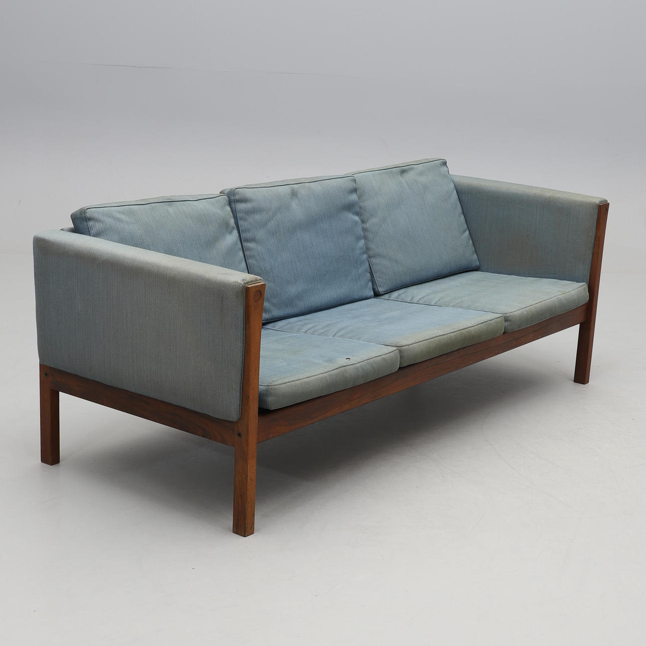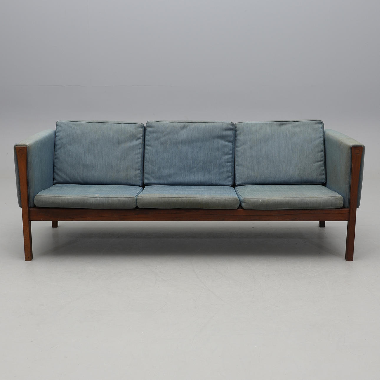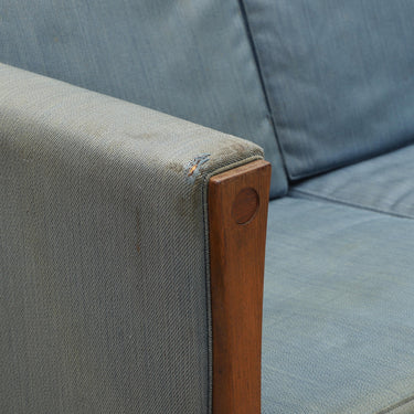 The sofa is built on a solid rosewood frame with firm upholstery, balanced by loose seat and back cushions that introduce softness to the clean-lined form. Wegner’s innovation of down-wrapped foam cushions added a new level of comfort while retaining structural precision.