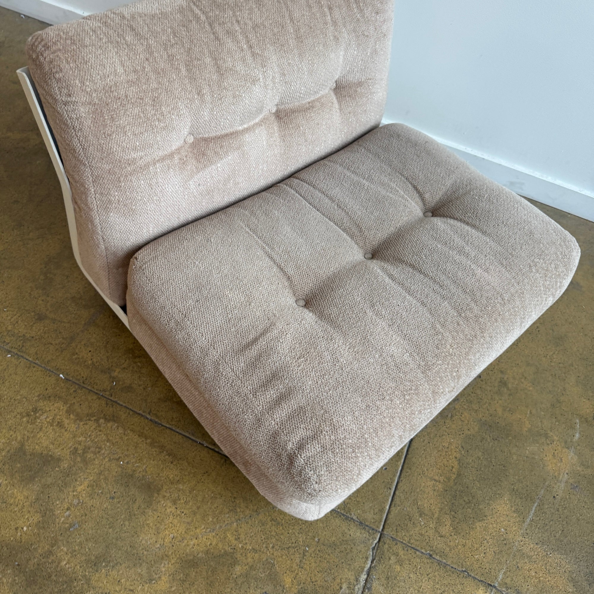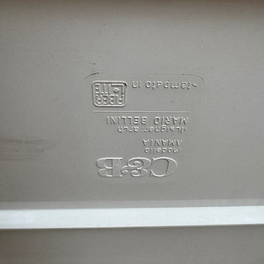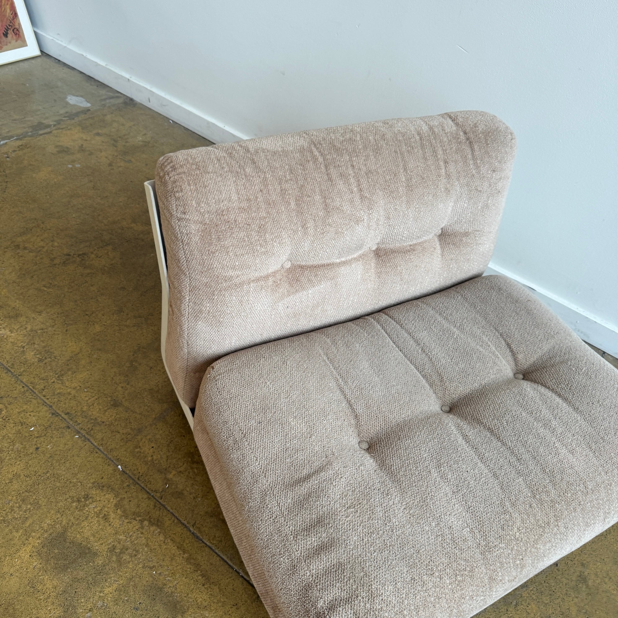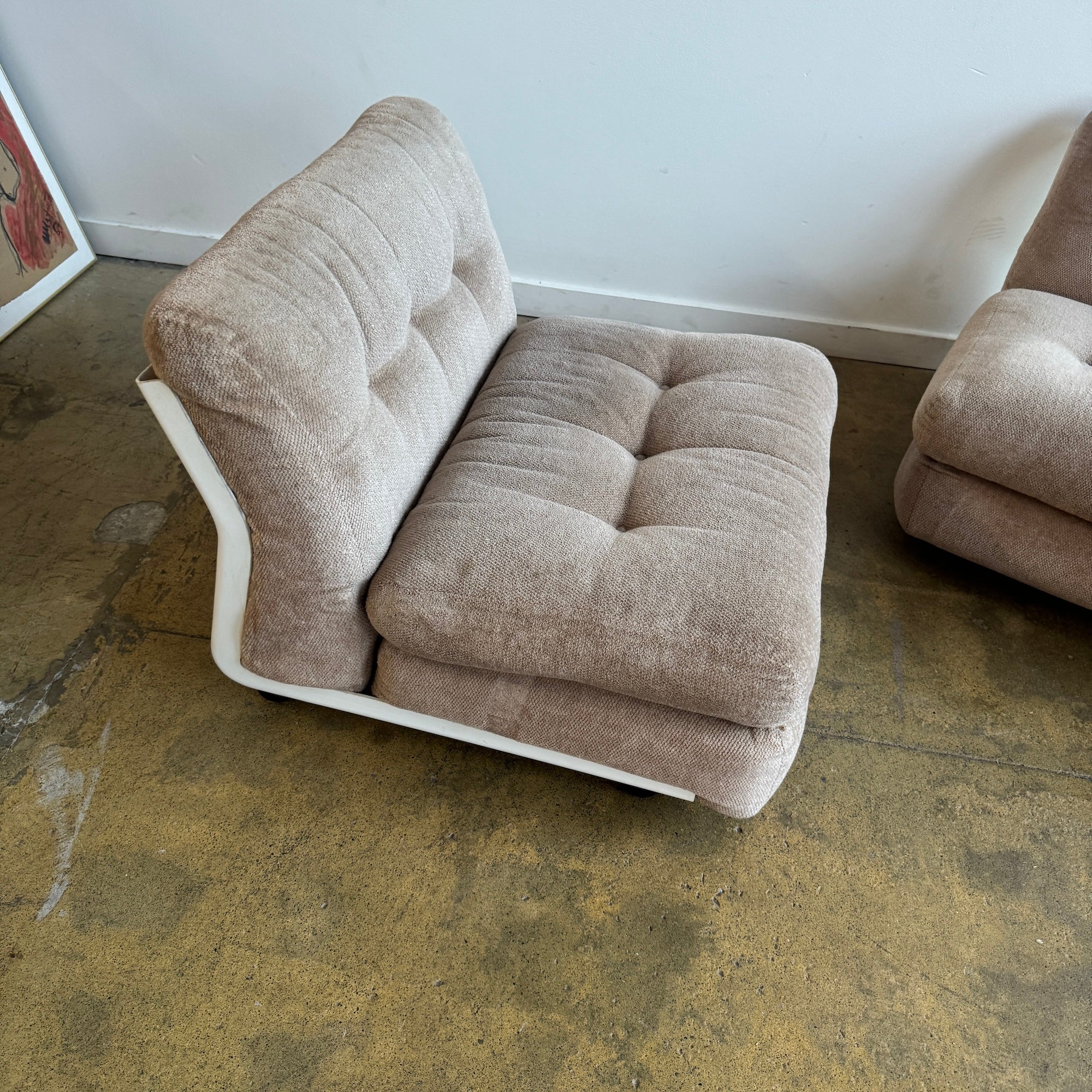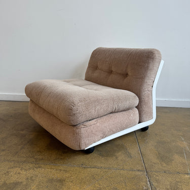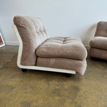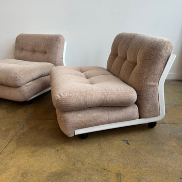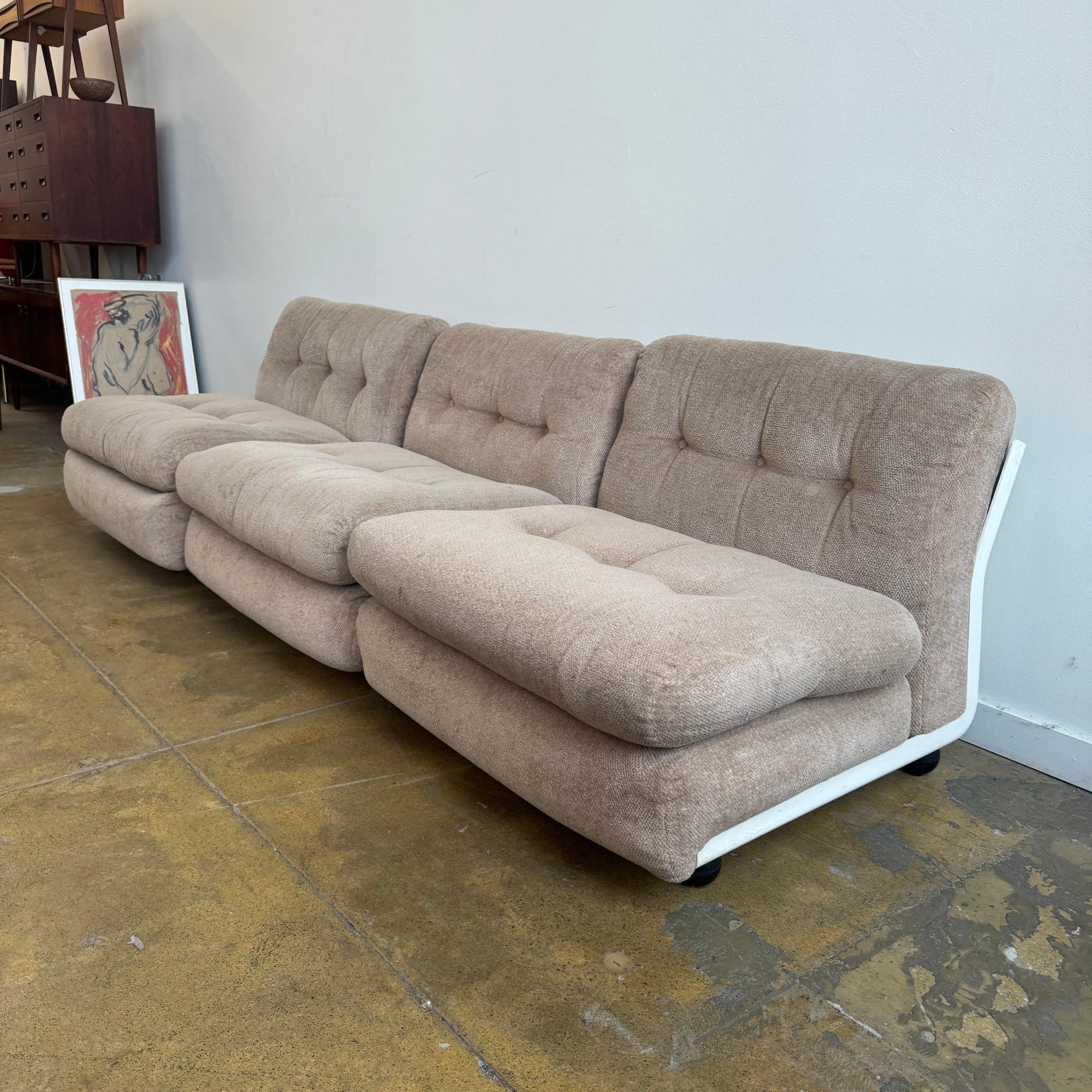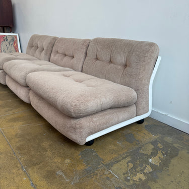 Iconic modular sofa system designed by Mario Bellini for later B&B Italia. The “Amanta” series features sculptural fiberglass shell frames with distinctive back cutouts, resting on black ball feet. This set includes three armless modules with plush cushions upholstered in a soft beige textile.