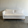 Crisp contours. Cradled comfort. Arms rise in lithe ascent. A wooden base imbues warmth. Sofa is originally used for staging project. The main sofa got damaged. Dimension is big enough for sofa, daybed, or extra seating.