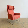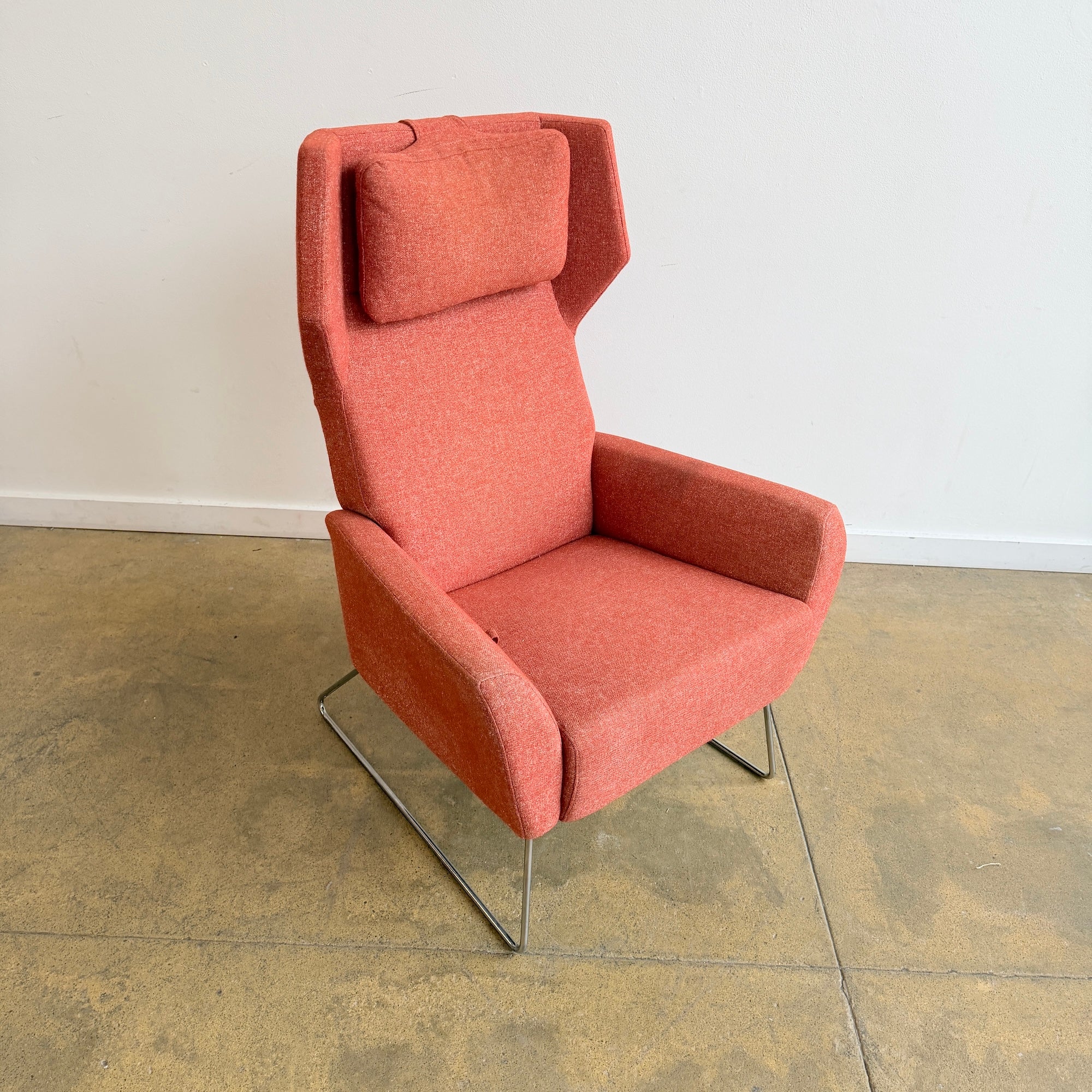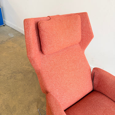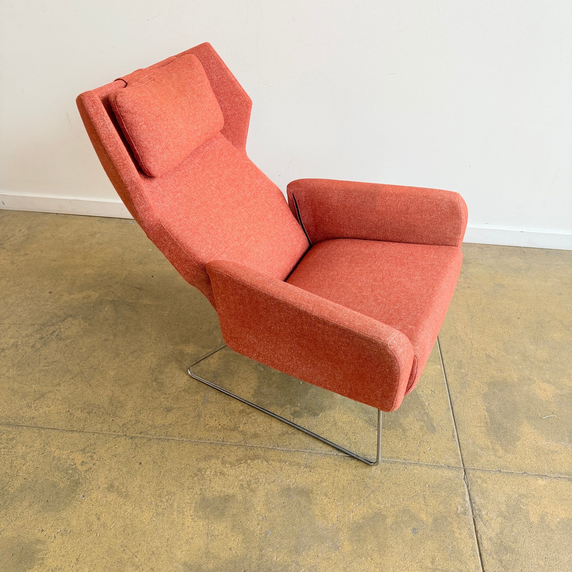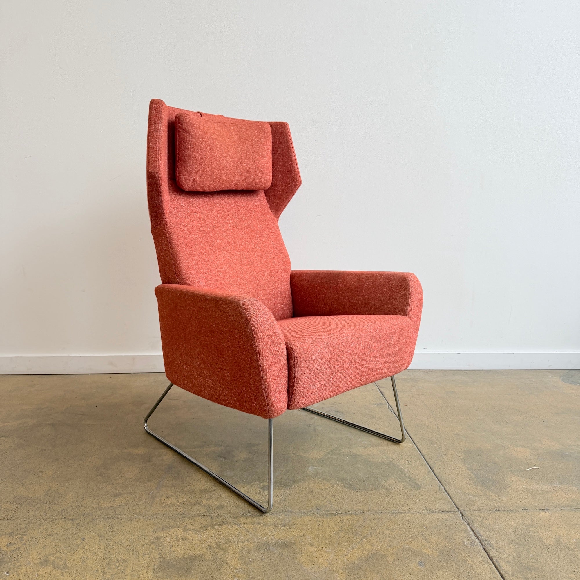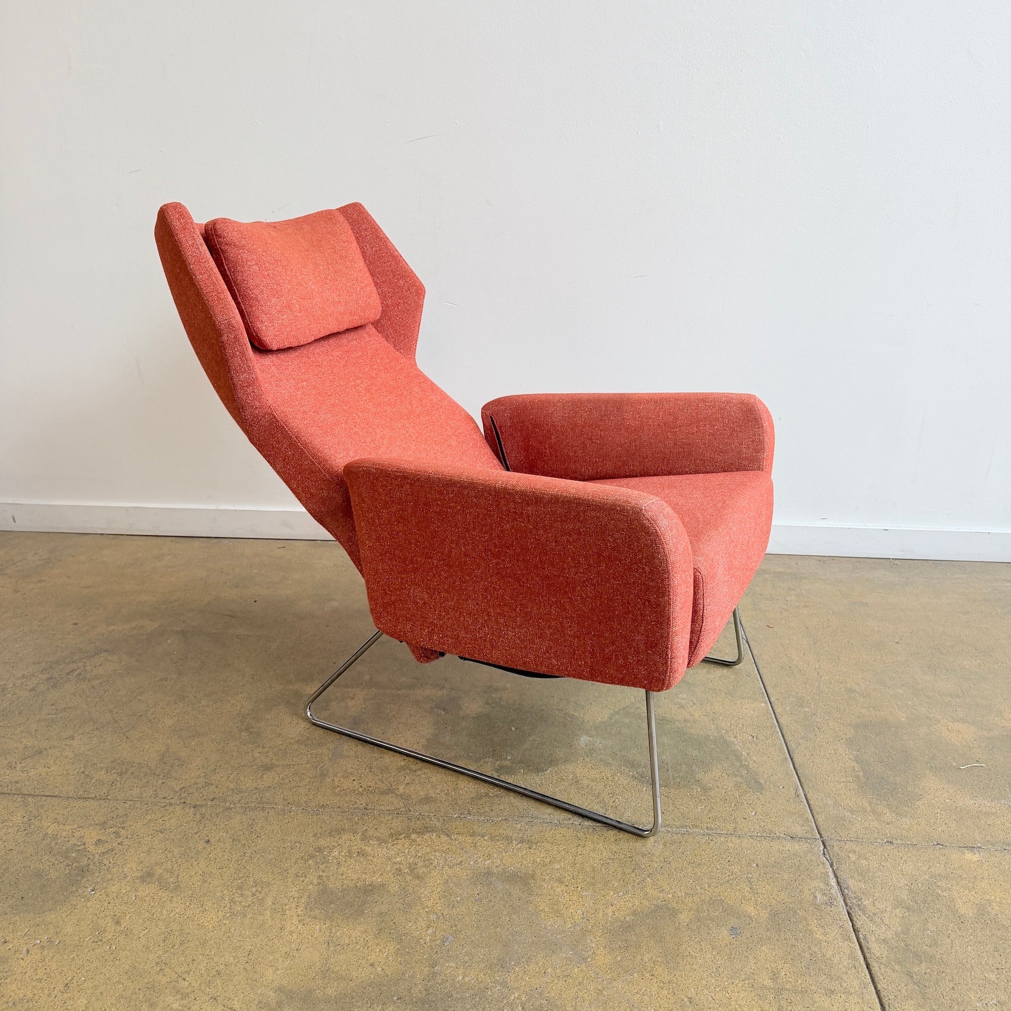 The Select Recliner designed by Roger Persson is both comfortable and practical offering a relaxing place to work or rest during the day. Chrome sled base with matching ottoman available.