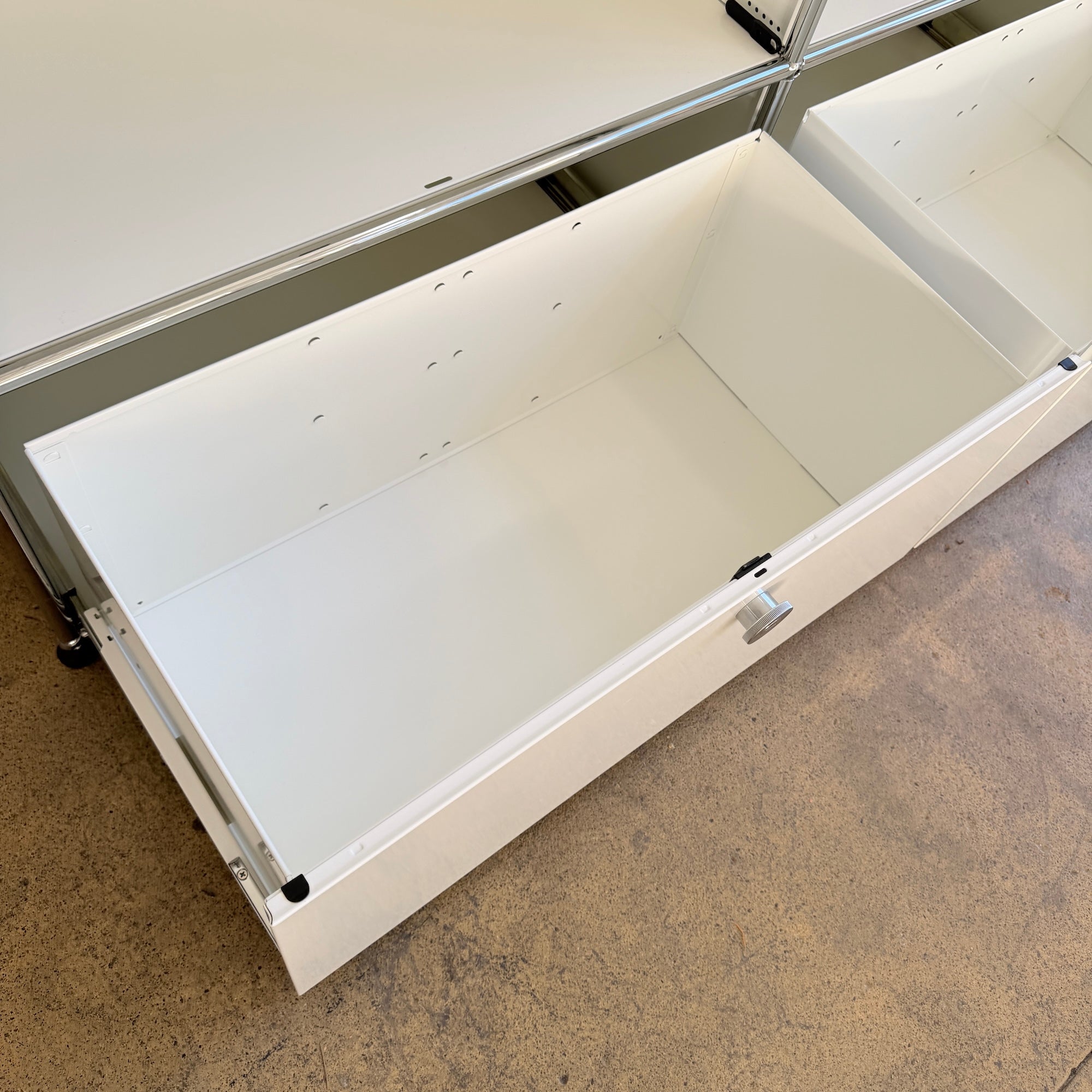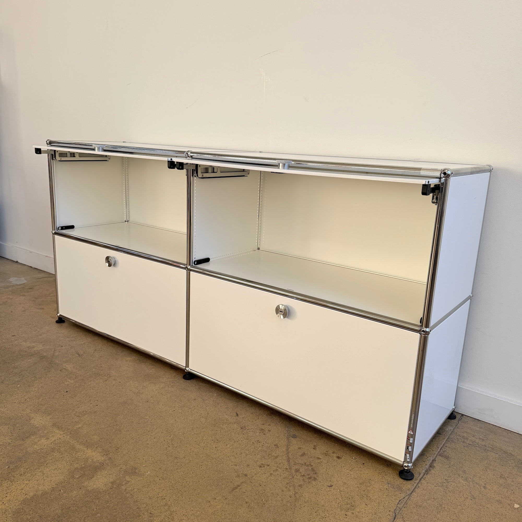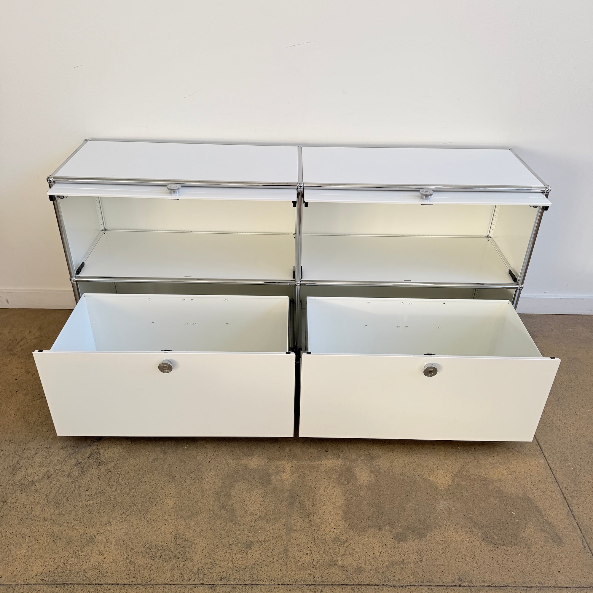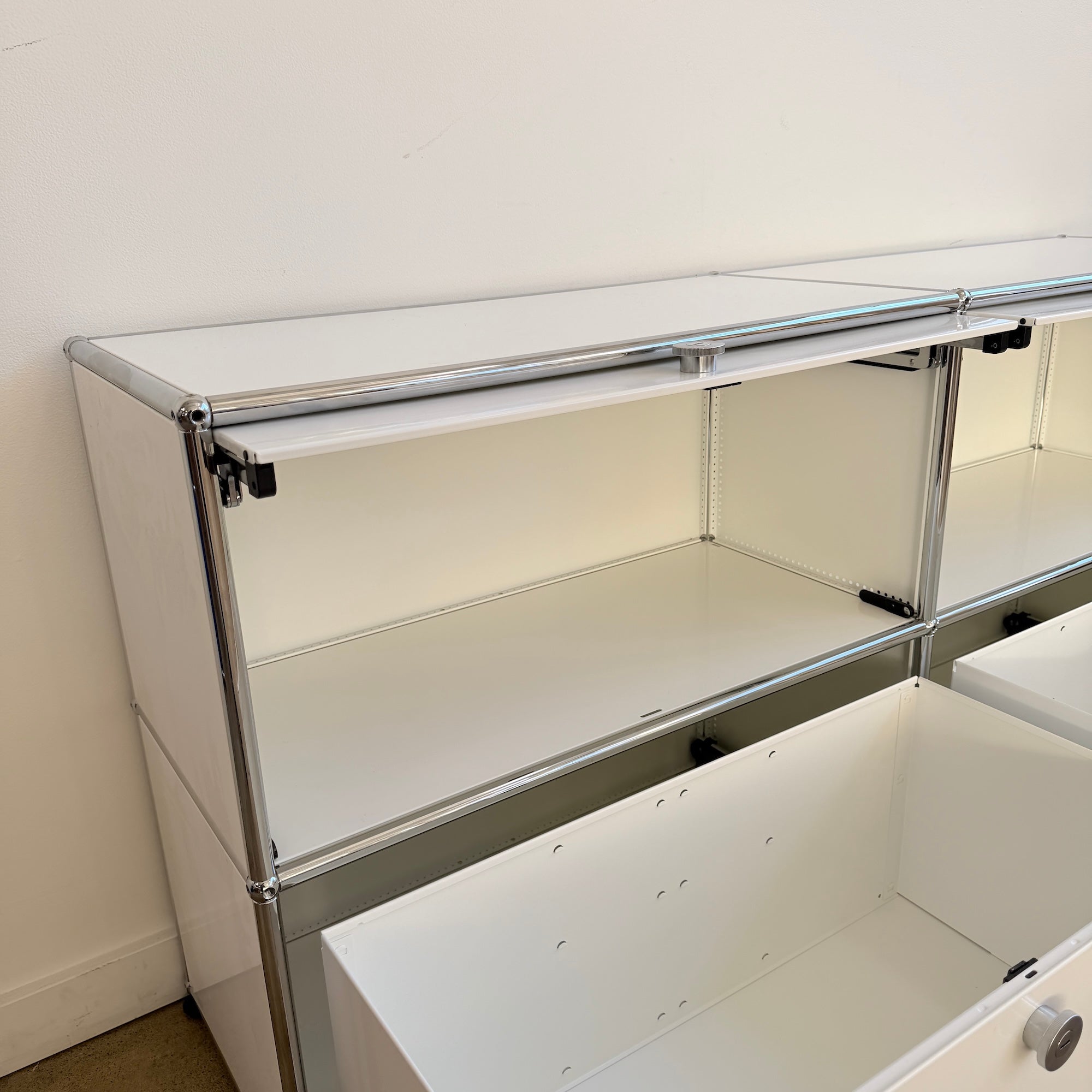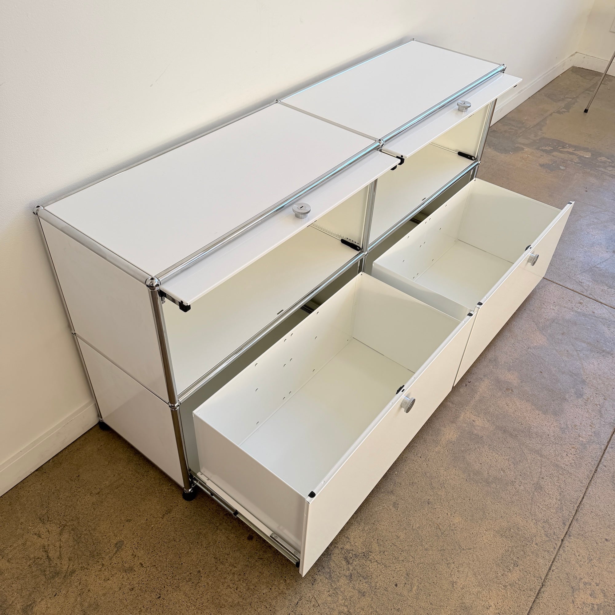 Rare USM Haller 2×2 configuration featuring two flip-up doors on the upper section and two pull-out drawers below, complete with metal inserts for organized storage. A highly versatile and clean-lined setup that works beautifully as a media console, credenza, or low storage solution. New condition.