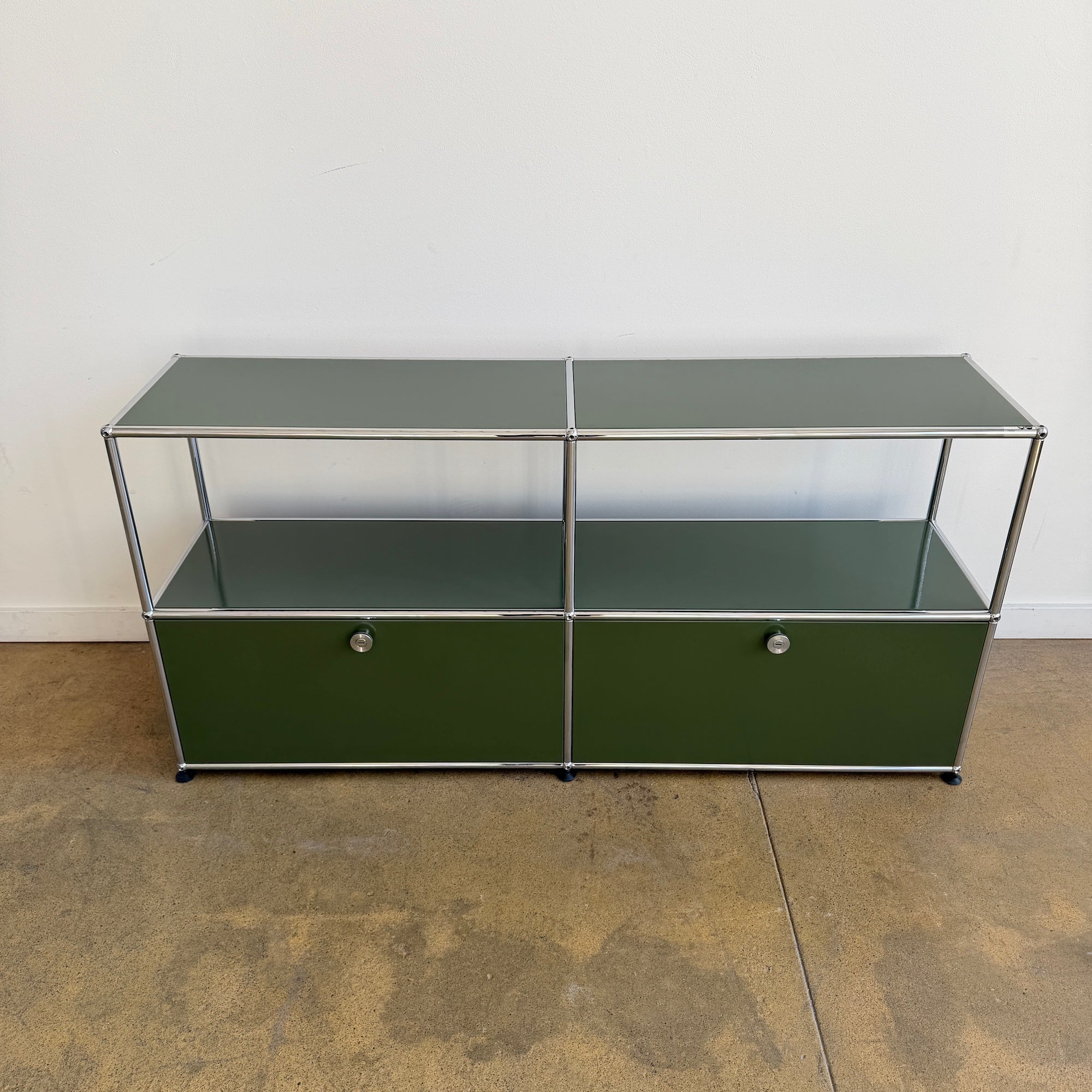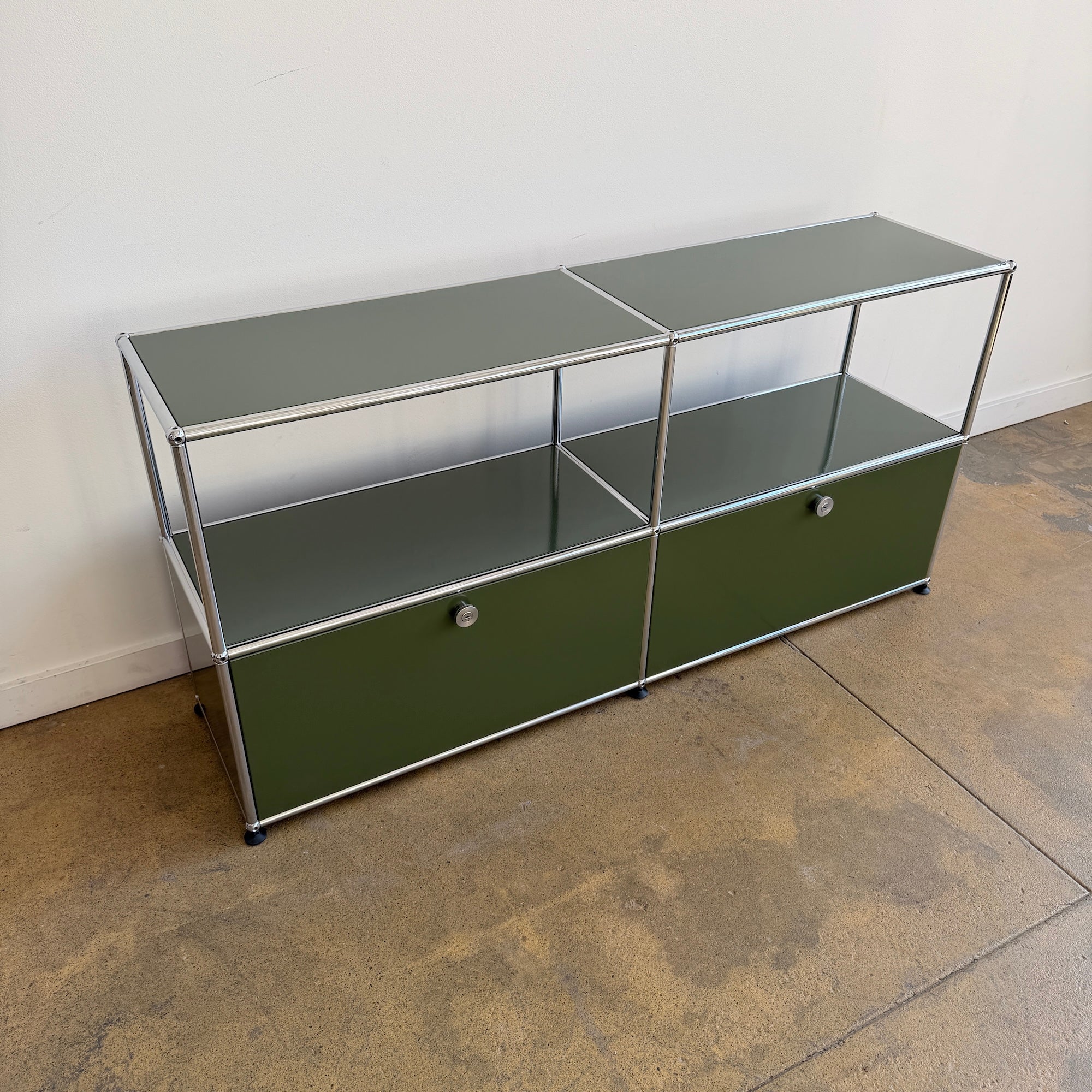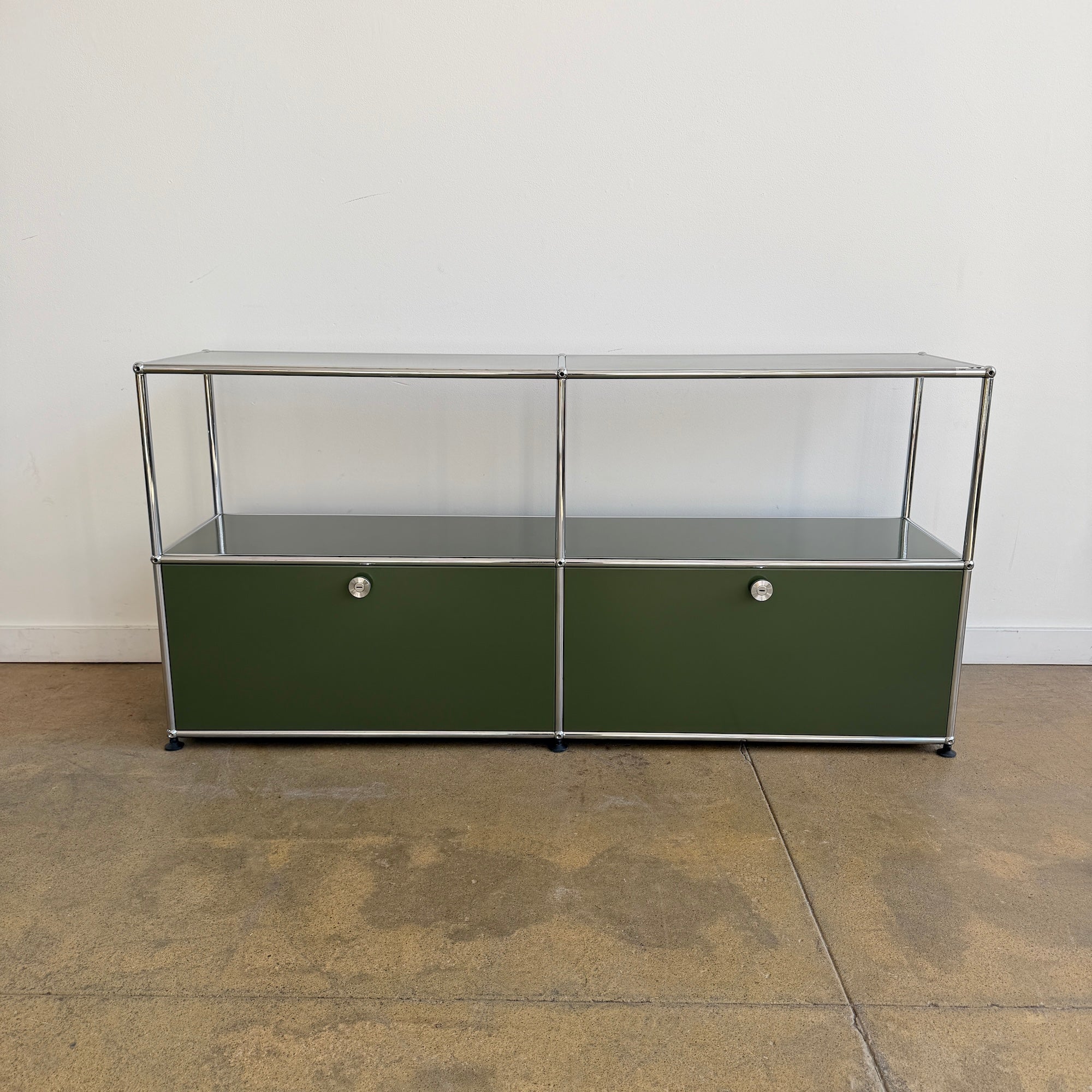 This USM Haller console is in pristine condition. The two upper unit is left open with two drop down closed door.