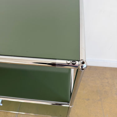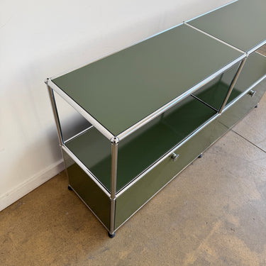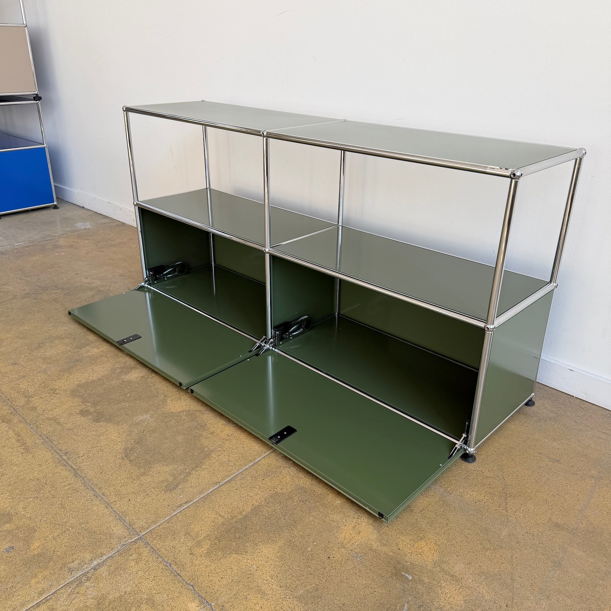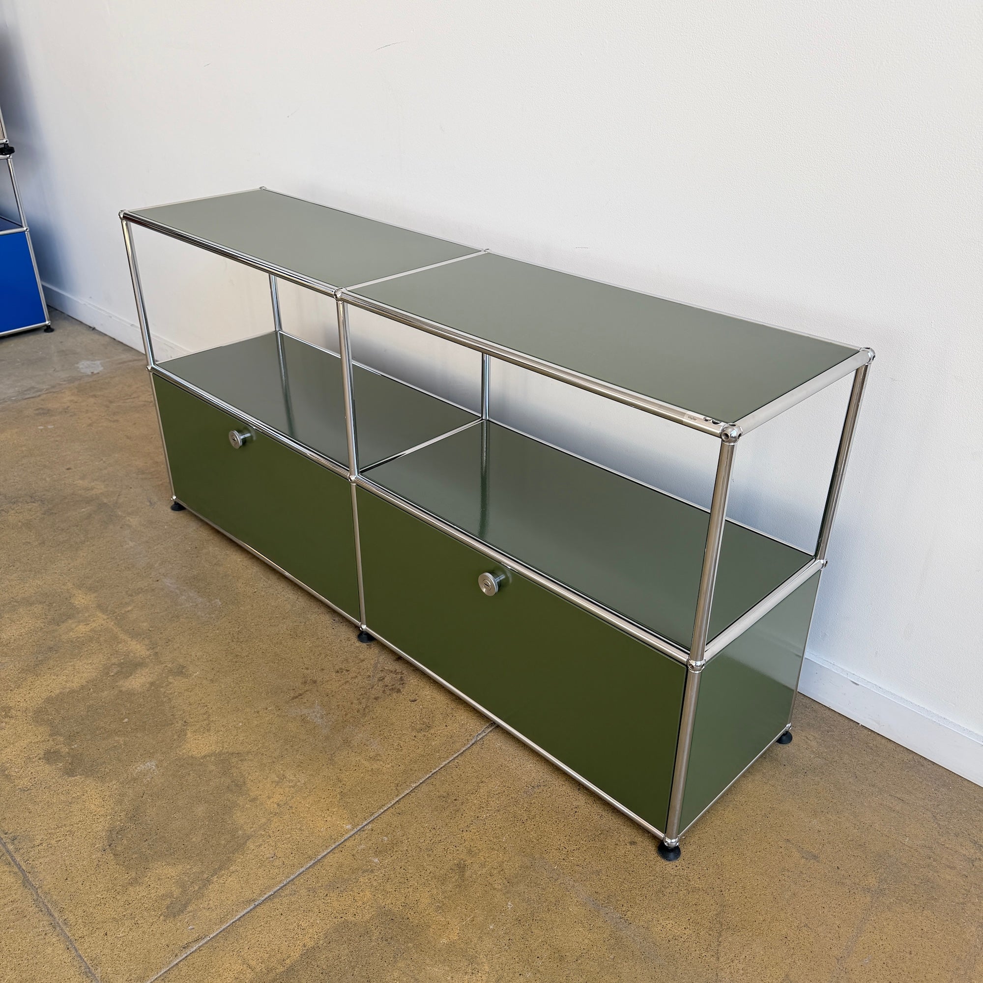 This USM Haller console is in pristine condition. The two upper unit is left open with two drop down closed door.