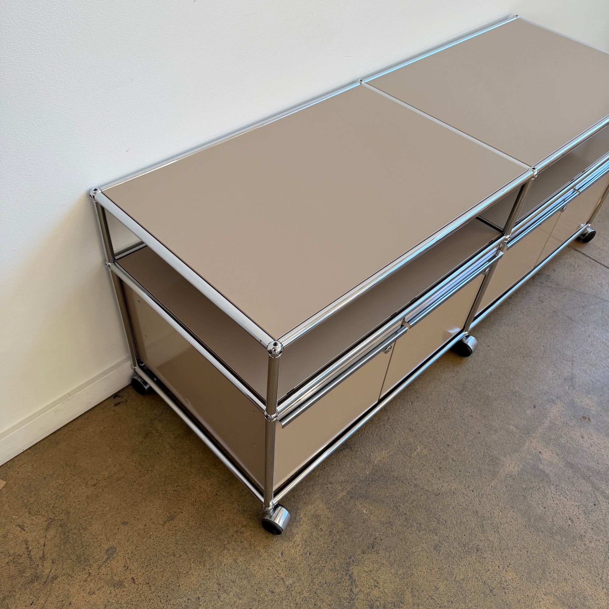 The unit is in good overall condition. Drawers glide smoothly and are clean inside, with proper ventilation slots intact. Panels present very well with only light, minimal signs of use consistent with age. Chrome frame is clean and bright, and the casters roll smoothly.