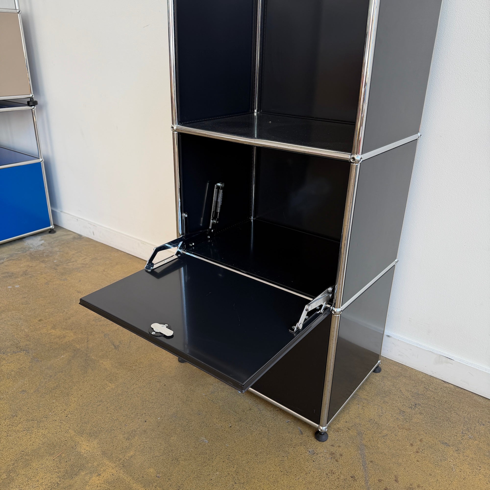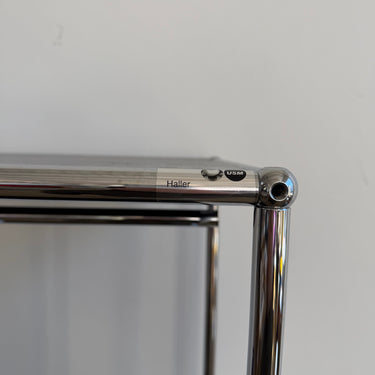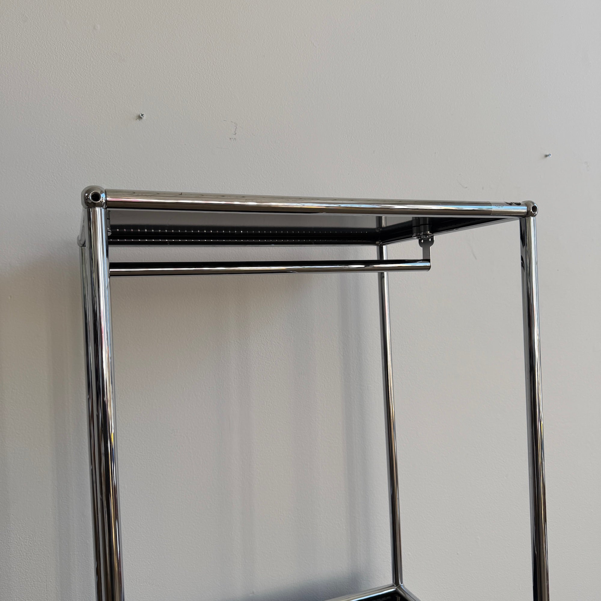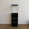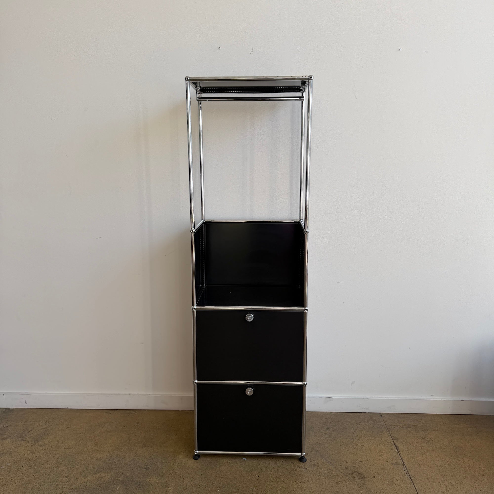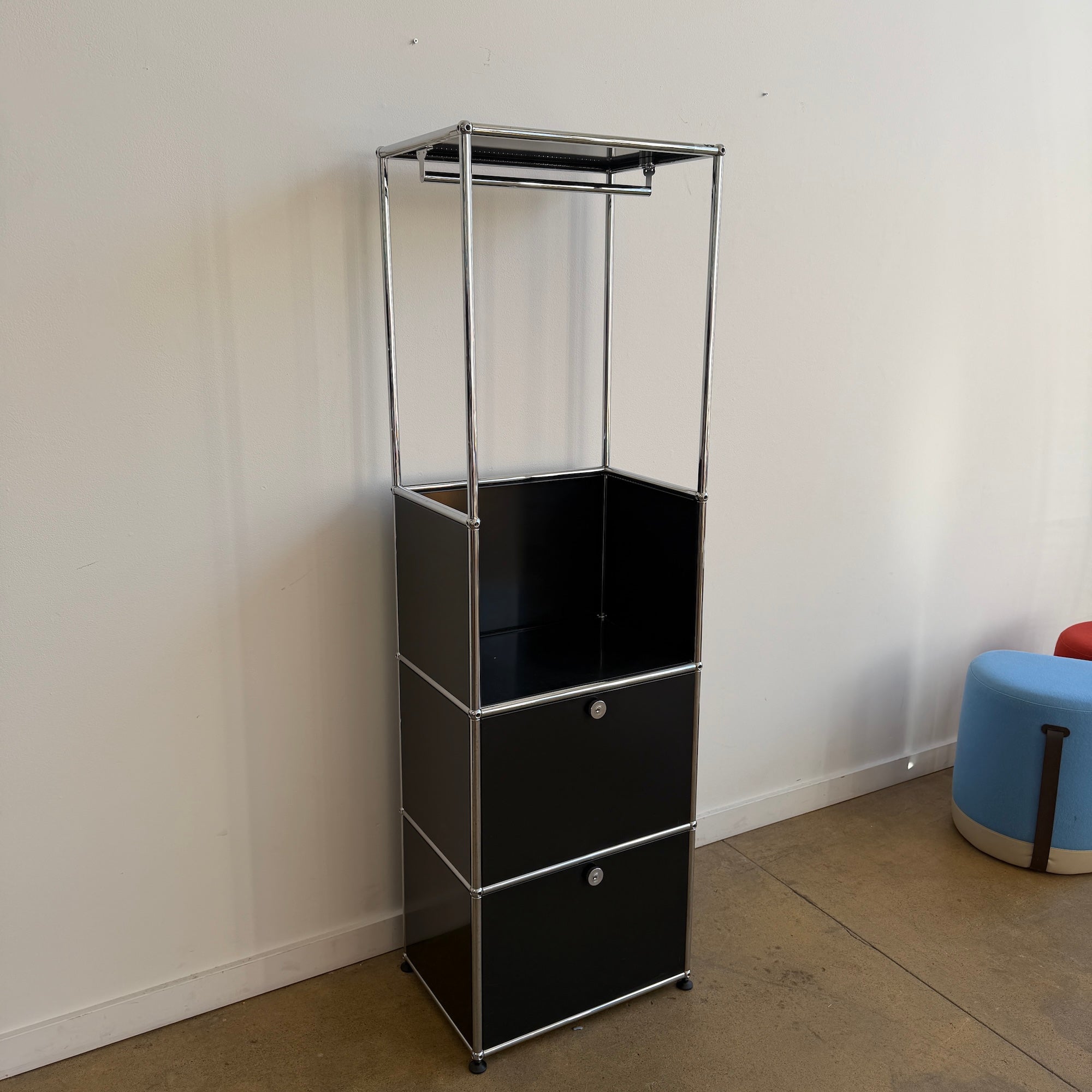 This USM Haller compact wardrobe combines a sleek chrome frame with black panels and an integrated hanging rail, creating a highly functional vertical storage piece in a small footprint that works beautifully in an entryway, bedroom, or dressing area. The open upper section is designed for coats or garments, while the two lower drop-down doors provide concealed storage for shoes, bags, or everyday essentials, making it both practical and visually light. The unit is in good overall condition with only light, age-appropriate scuffs to the panels and frame that do not detract from its clean modern appearance.
