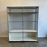 This USM Haller Wardrobe features two hanger racks and a storage cabinet on the top and bottom, as well as perforated panels. The panels are in excellent condition, and the wardrobe is equipped with five casters for easy movement throughout the house. This is a rare piece that is hard to come by.