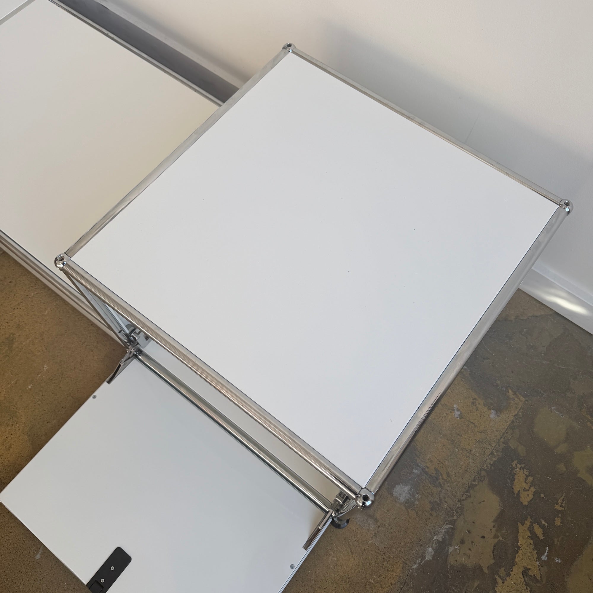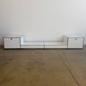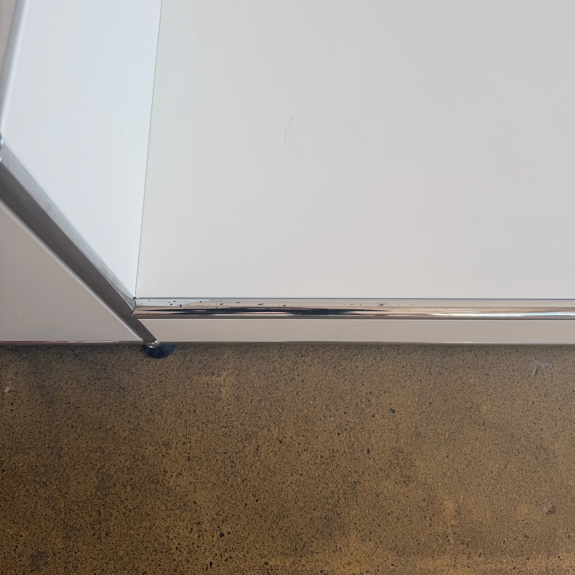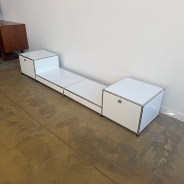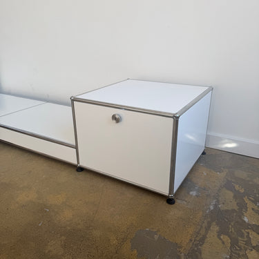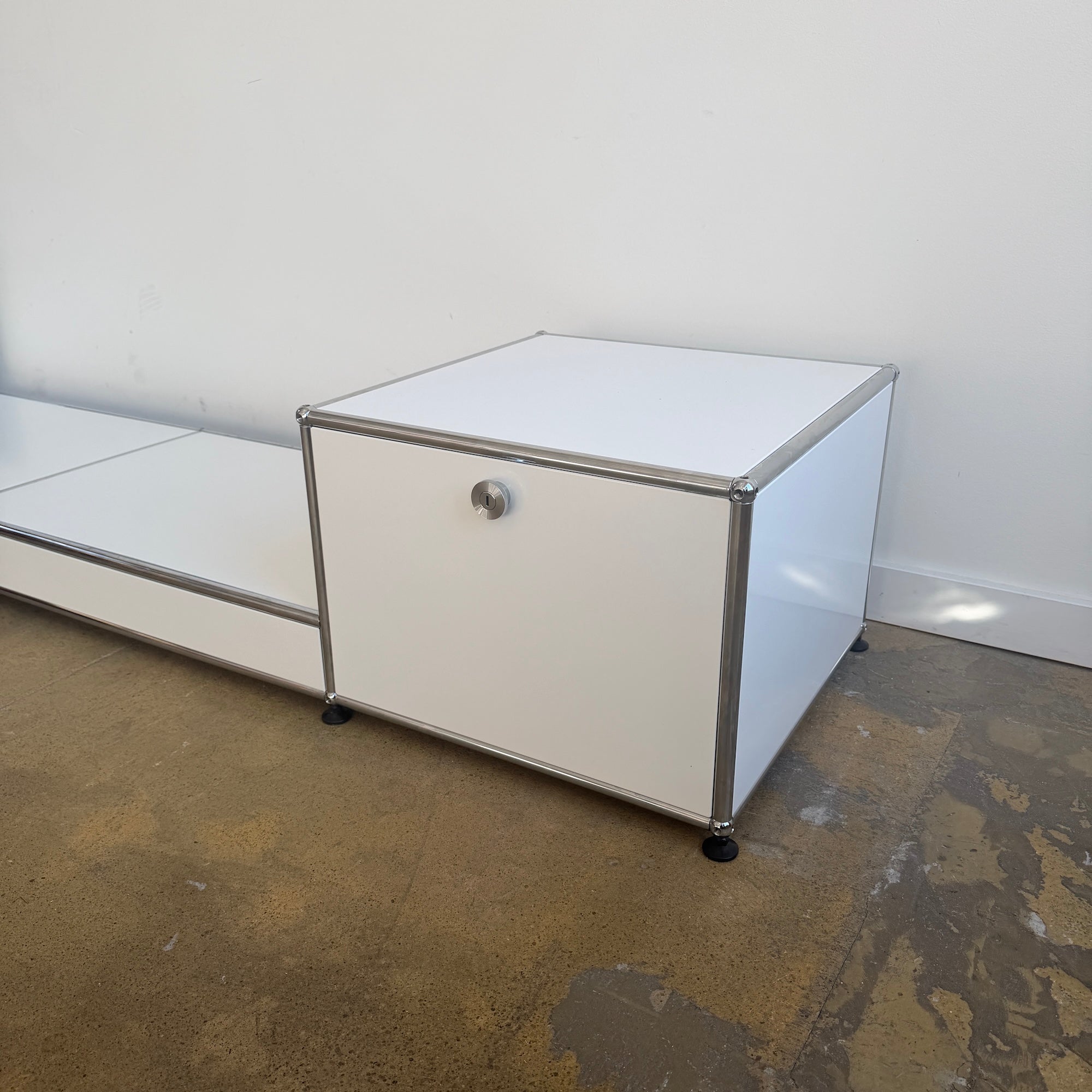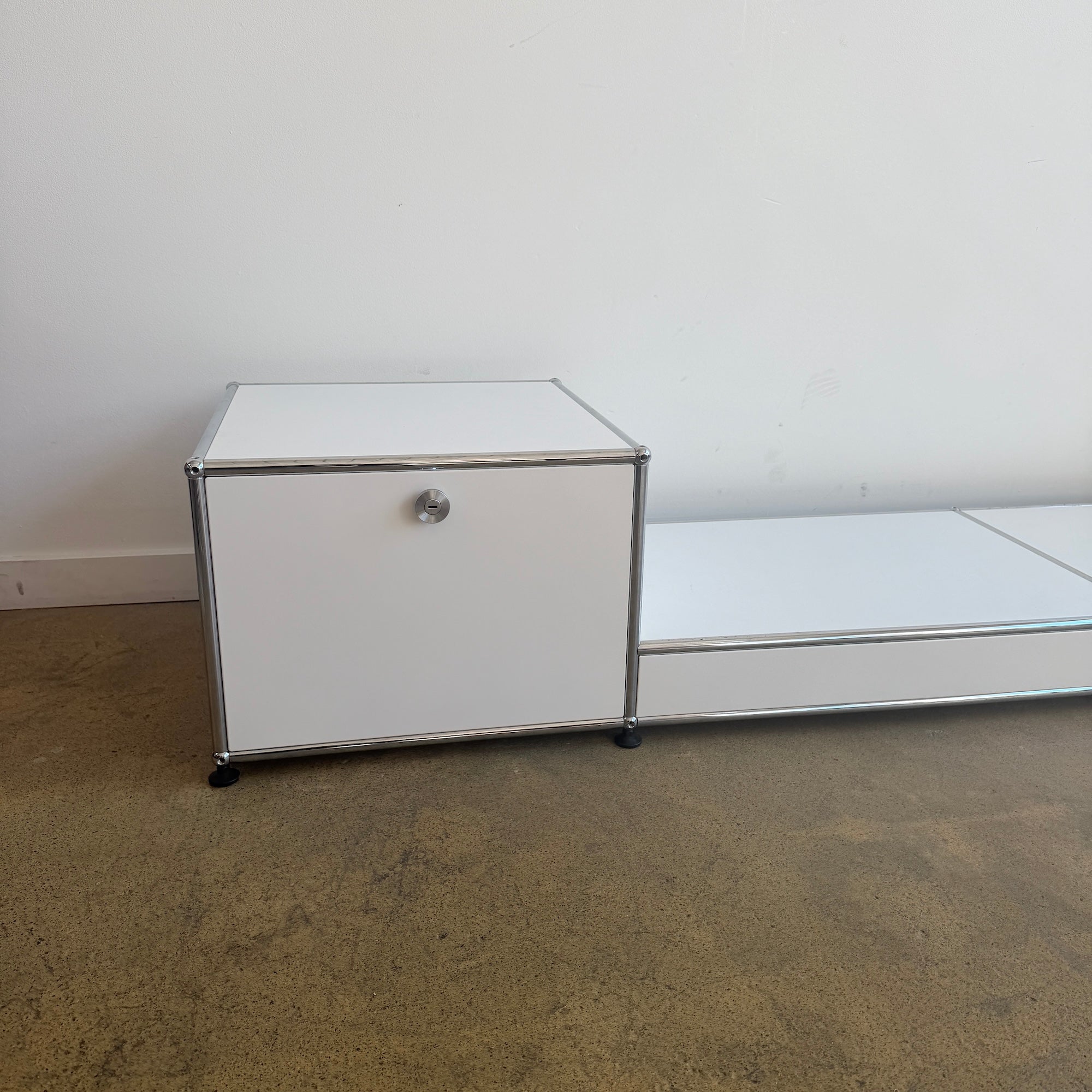 USM Haller media console in pure white, featuring a sleek and functional low-profile design. This piece includes two drop-down doors on each end for concealed storage, while the central section remains open, ideal for media components or display. Finished with chrome framing and signature modular construction, it embodies the timeless versatility and quality USM is known for.