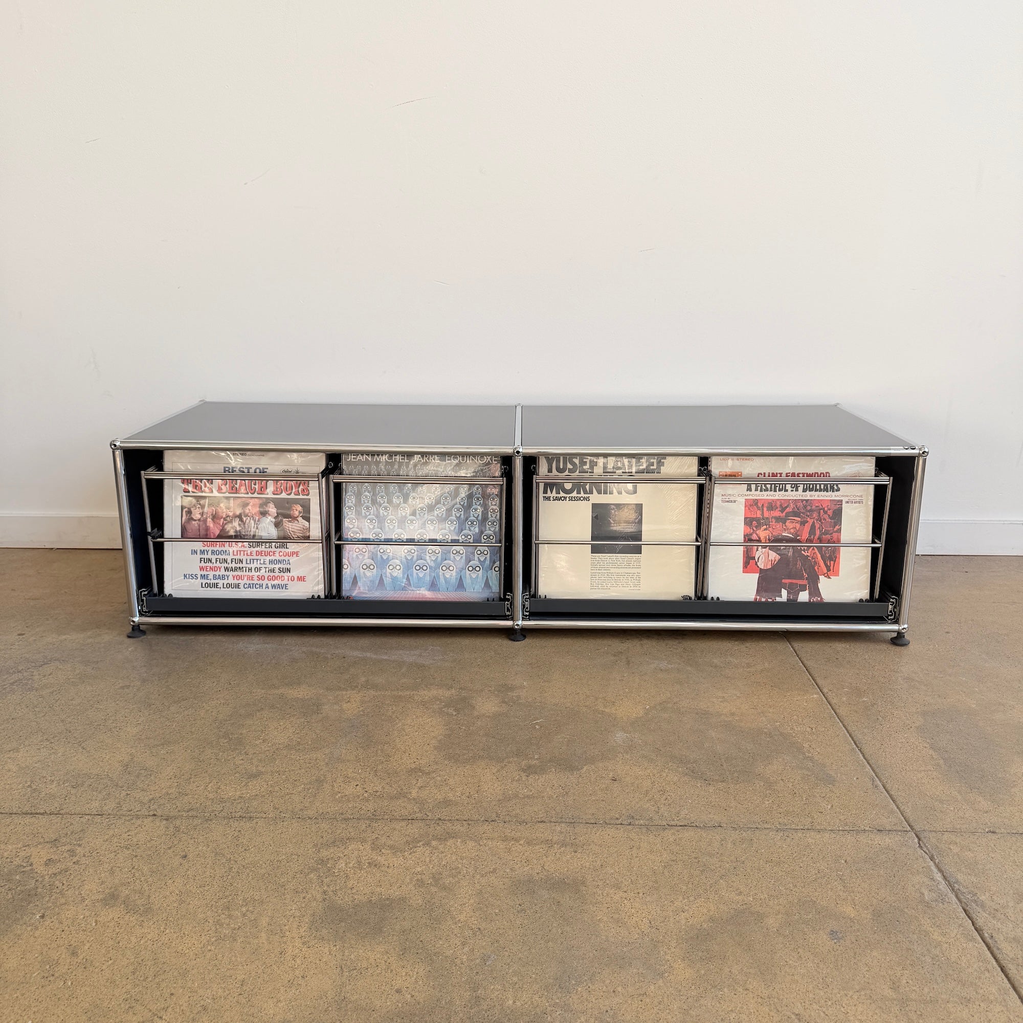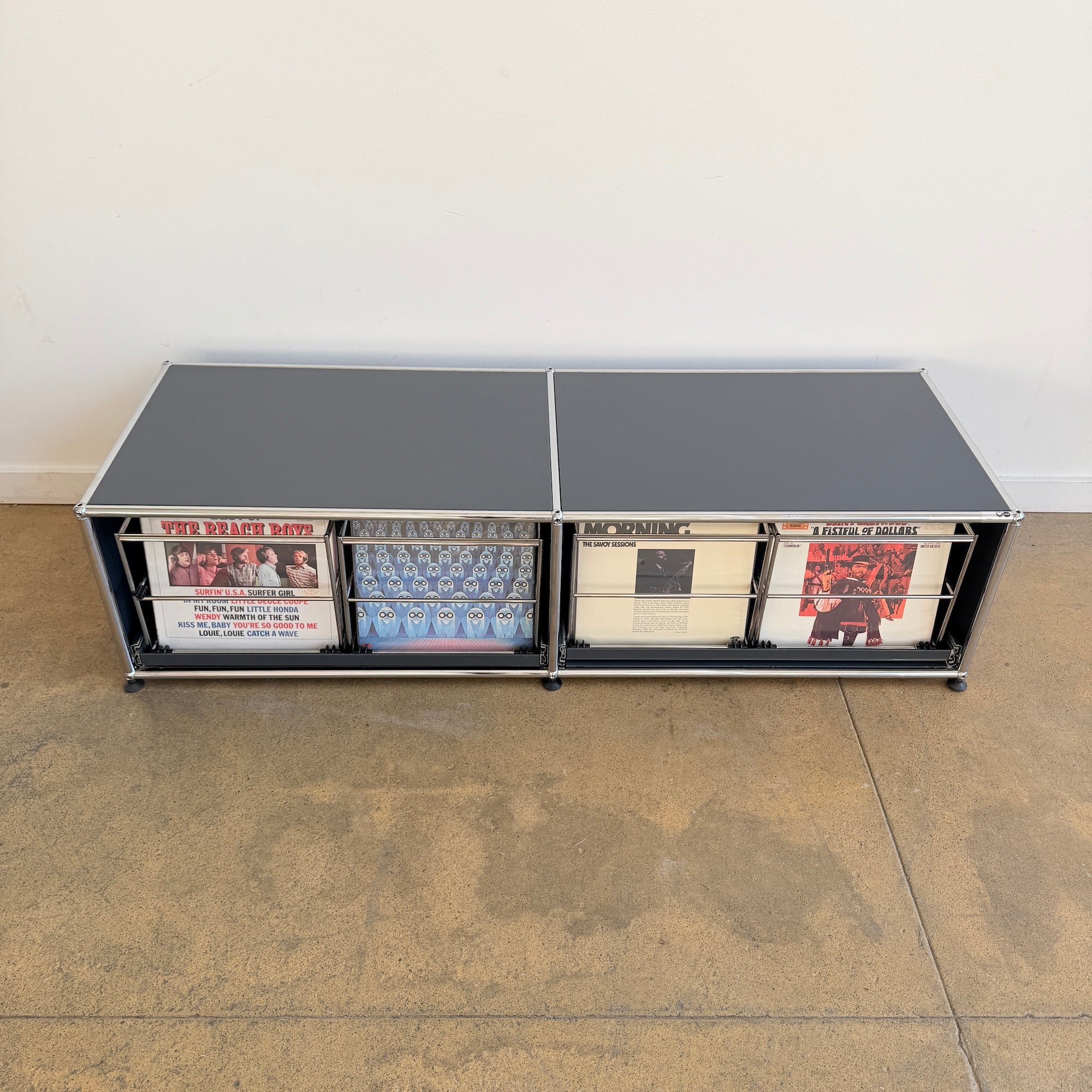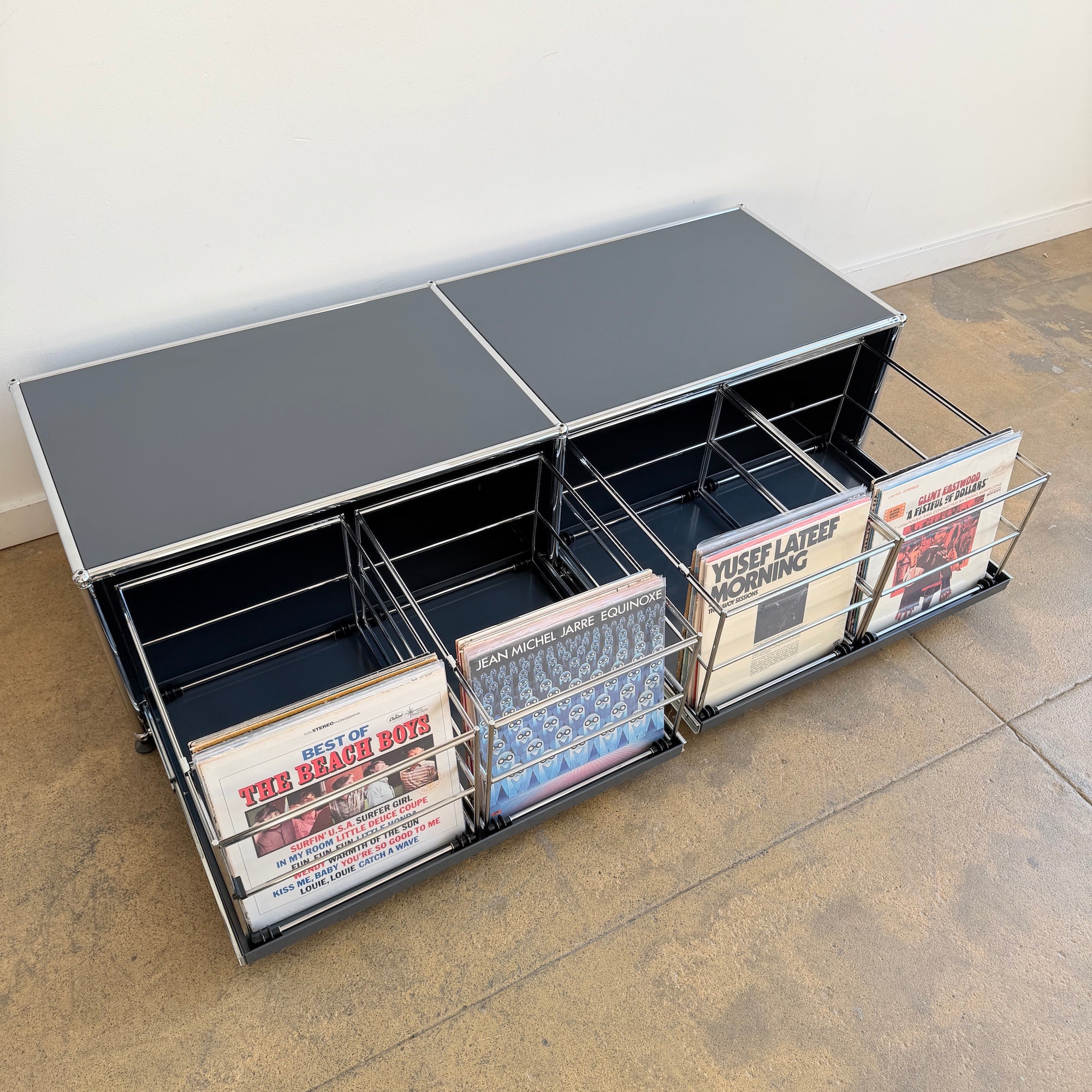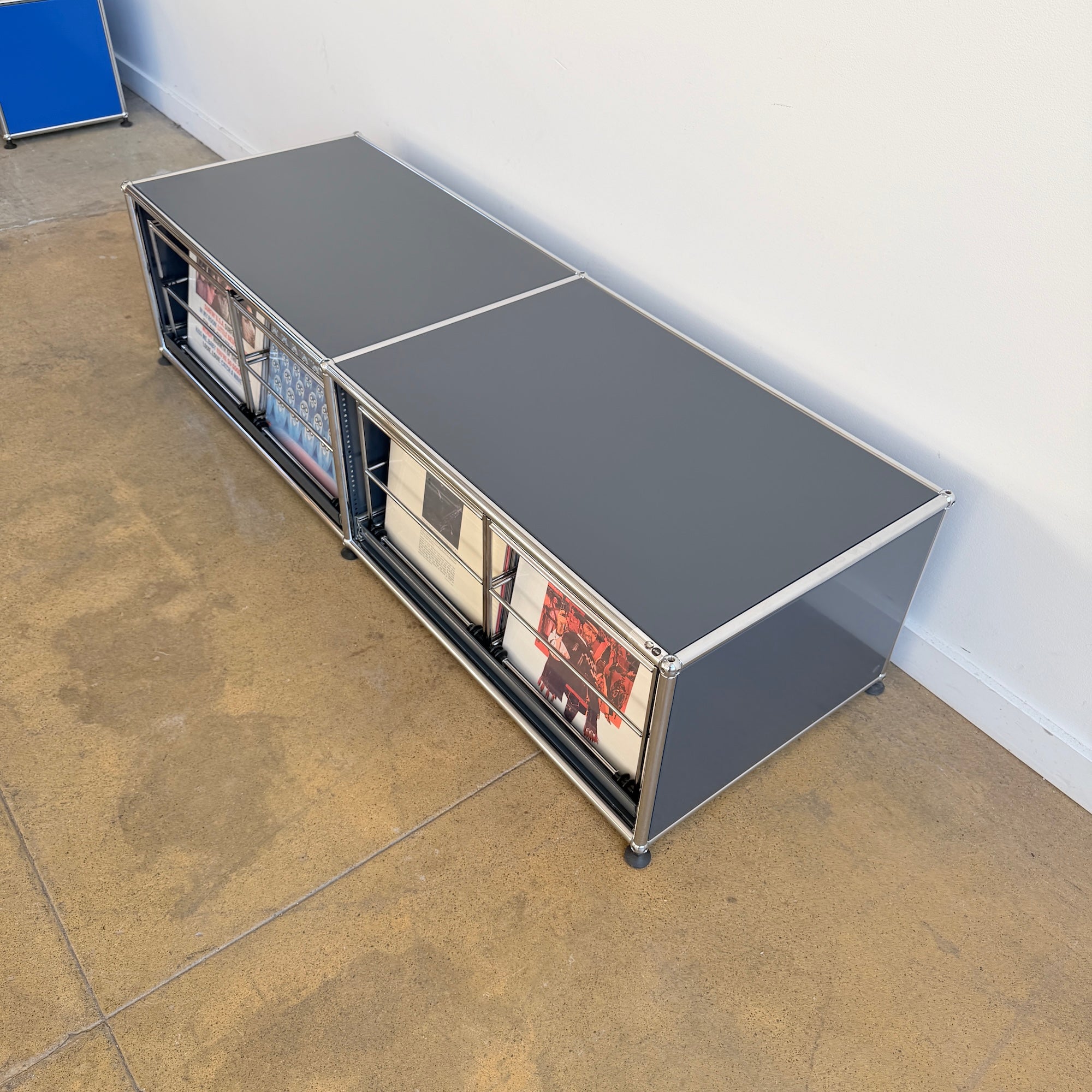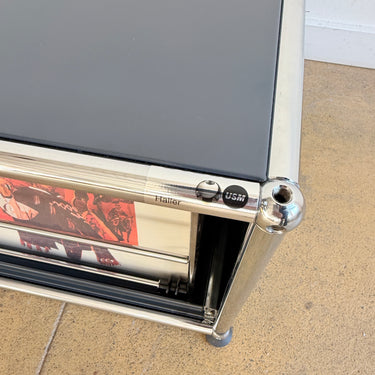 USM Haller low record storage unit in anthracite grey, featuring easy pull-out wire racks for convenient top-down browsing. Clean, minimal modular design with chrome frame and metal panels, perfect for vinyl storage and low media setups. Holds approximately 180–220 records. In good overall condition with light signs of use.