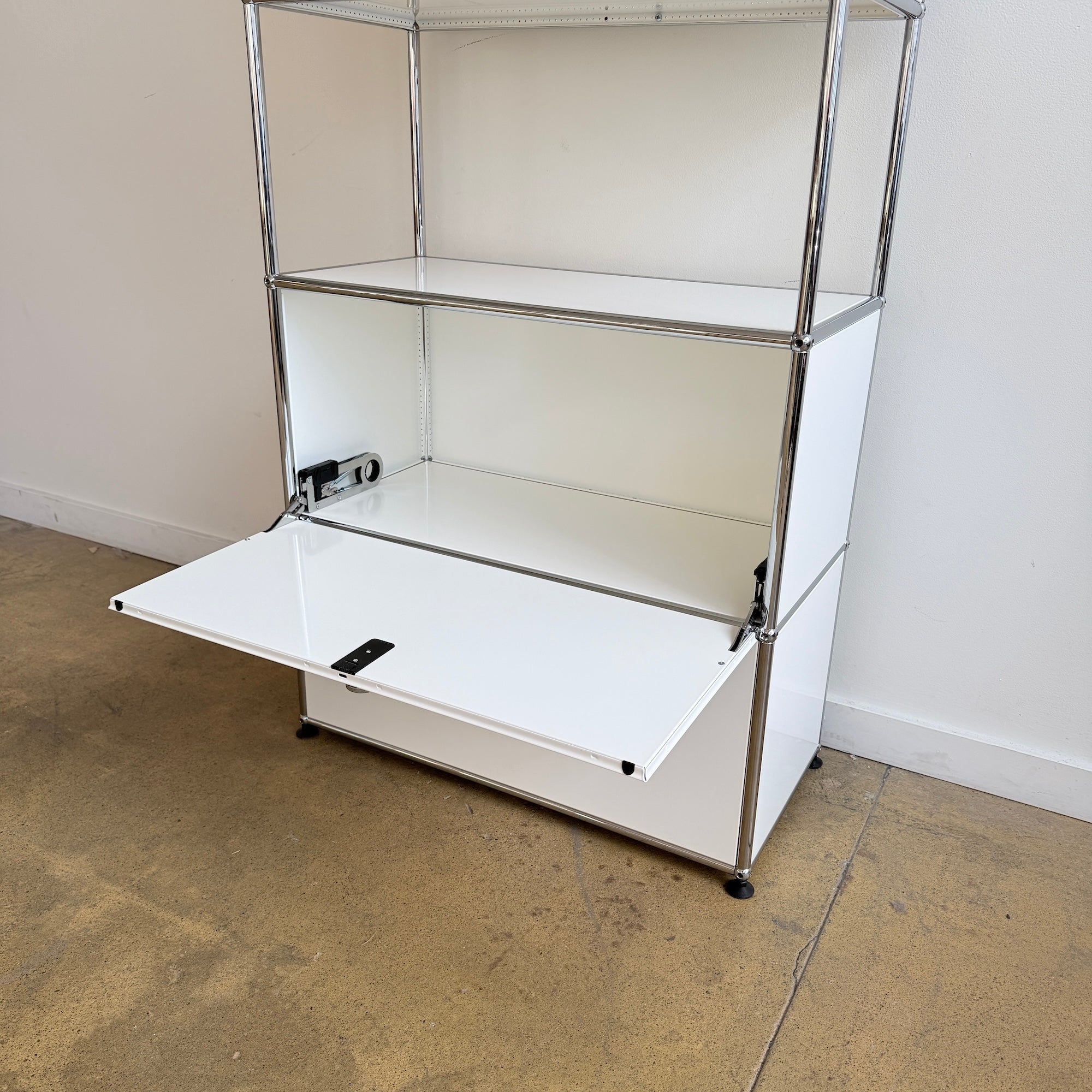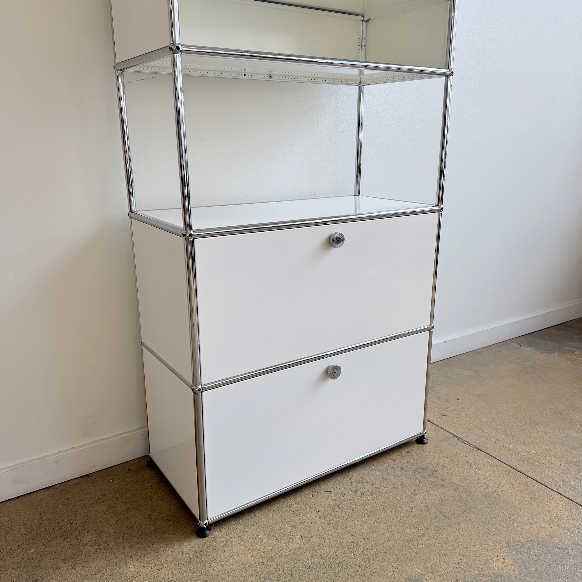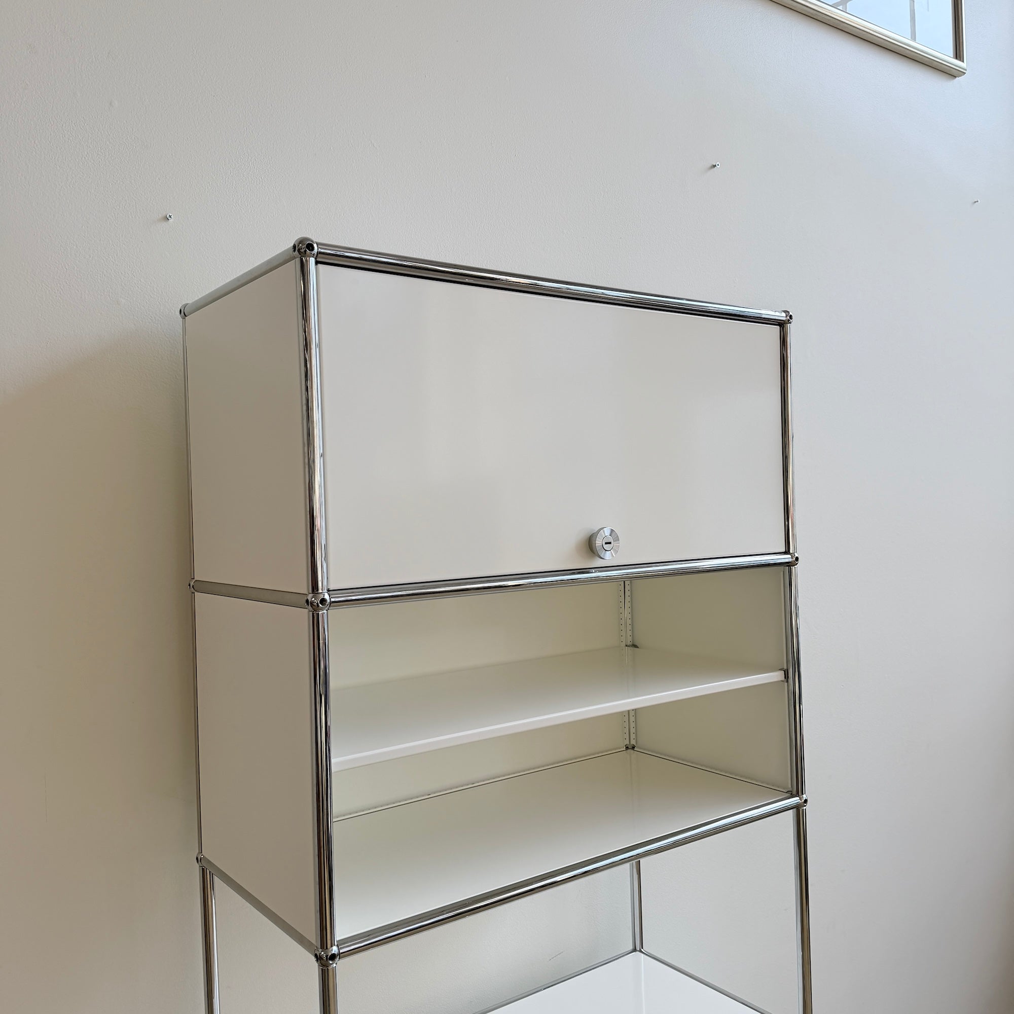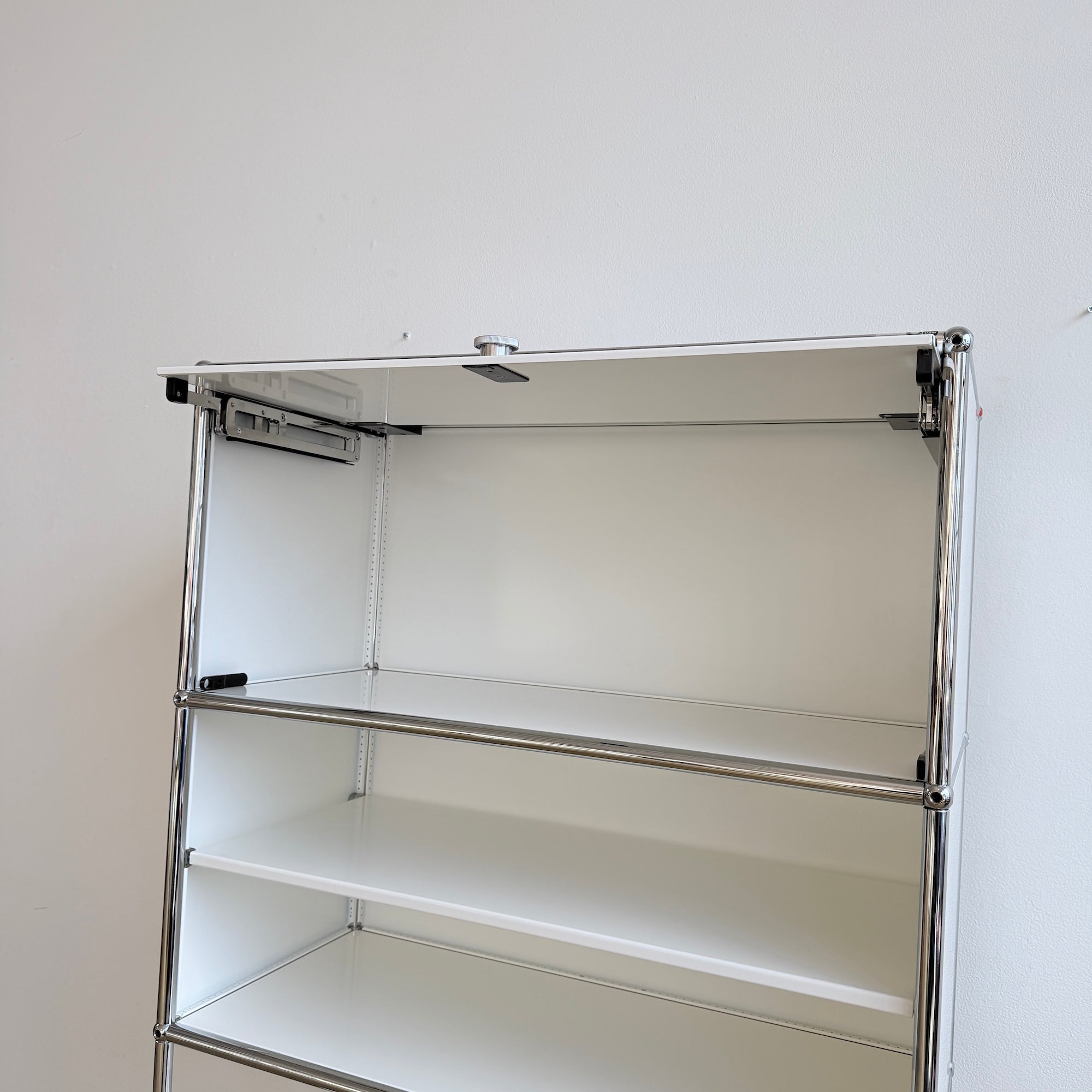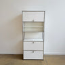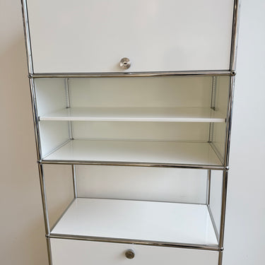 A clean and highly functional USM Haller tall unit in a versatile five-module configuration. Finished in classic white panels with chrome-plated steel frame, this piece features a flip-up door at the very top for easy overhead access, an open section with a divider shelf at the center, and two drop-down doors at the bottom for concealed storage. The vertical format makes it ideal for office storage, media, books, or organized home use while keeping a minimal, architectural presence.