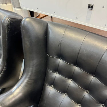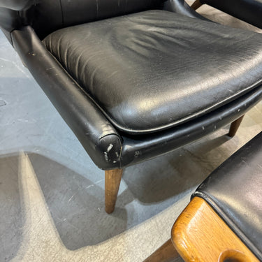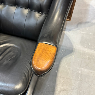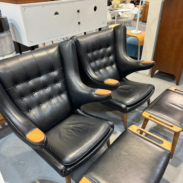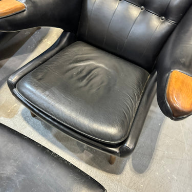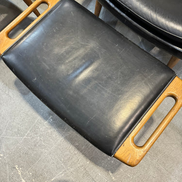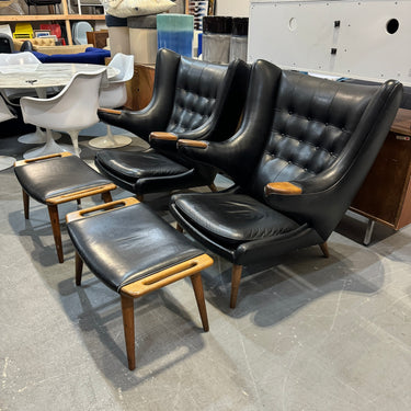 Note: This is not the Danish version which will cost around $30,000. This is a high end reproduction by Modernica. Handmade in LA with premium materials. Slightly more petite than the original version. Leather has some scuffs and wear. We will cover the cost to professionally recondition which will make all the scuffs go away. Two chairs and ottomans are available. The price is per chair.